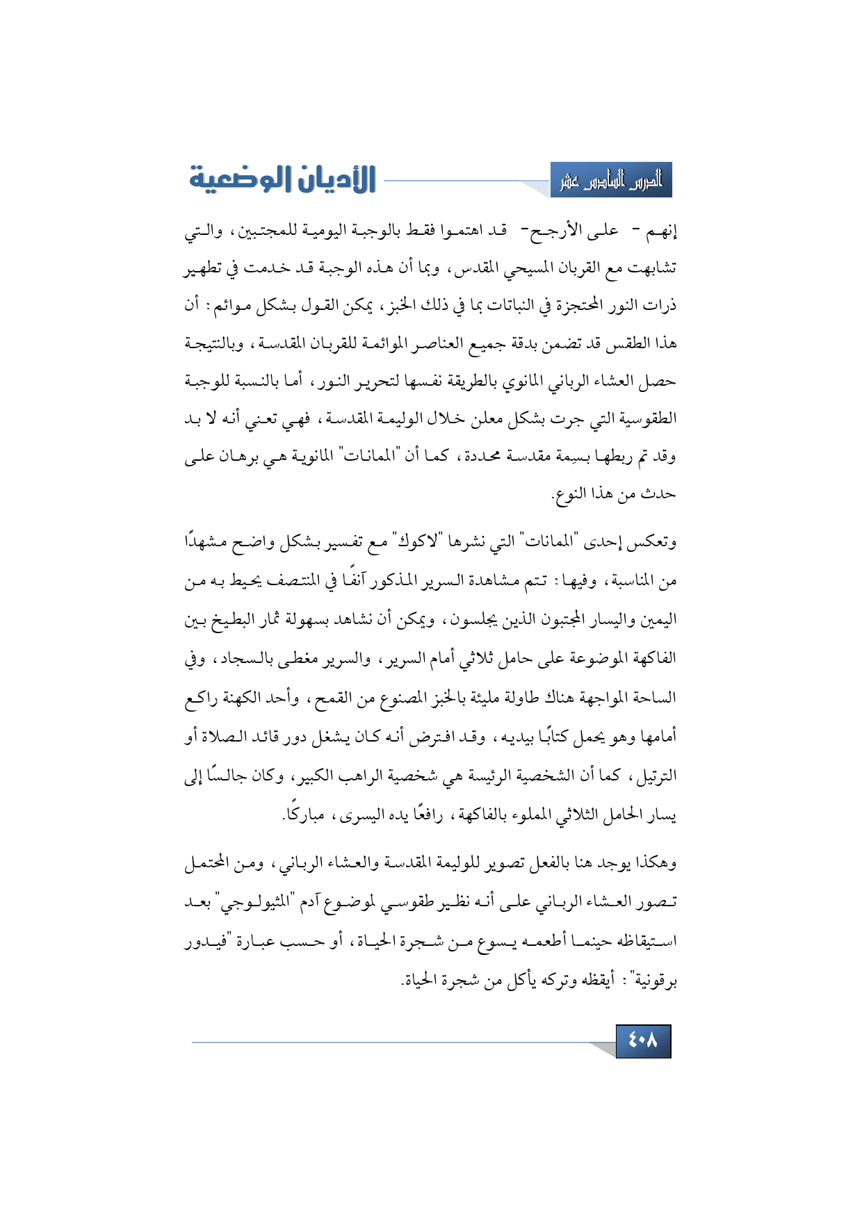 ويمكن الافتراء بجميع هذه الأمثلة أنهم على الأرجح اهتموا فقط بالوجبة اليومية للمجتبين، والتي تشابهت مع القربان المسيحي المقدس، وبما أن هذه الوجبة قد خدمت في تطهير ذارت النور المحتجزة في النباتات بما في ذلك الخبز، يمكن القول بشكل موائم: أن هذا الطقس قد تضمن بدقة جميع العناصر الموائمة للقربان المقدسة، وبالنتيجة حصل العشاء الرباني المانوي بالطريقة نفسها لتحرير النور، أما بالنسبة للوجبة الطقوسية التي جرت بشكل معلن خلال الوليمة المقدسة، فهي تعني أنه لا بد وقد تم ربطها بسِمة مقدسة محددة، كما أن "الممانات" المانوية هي برهان على حدث من هذا النوع.