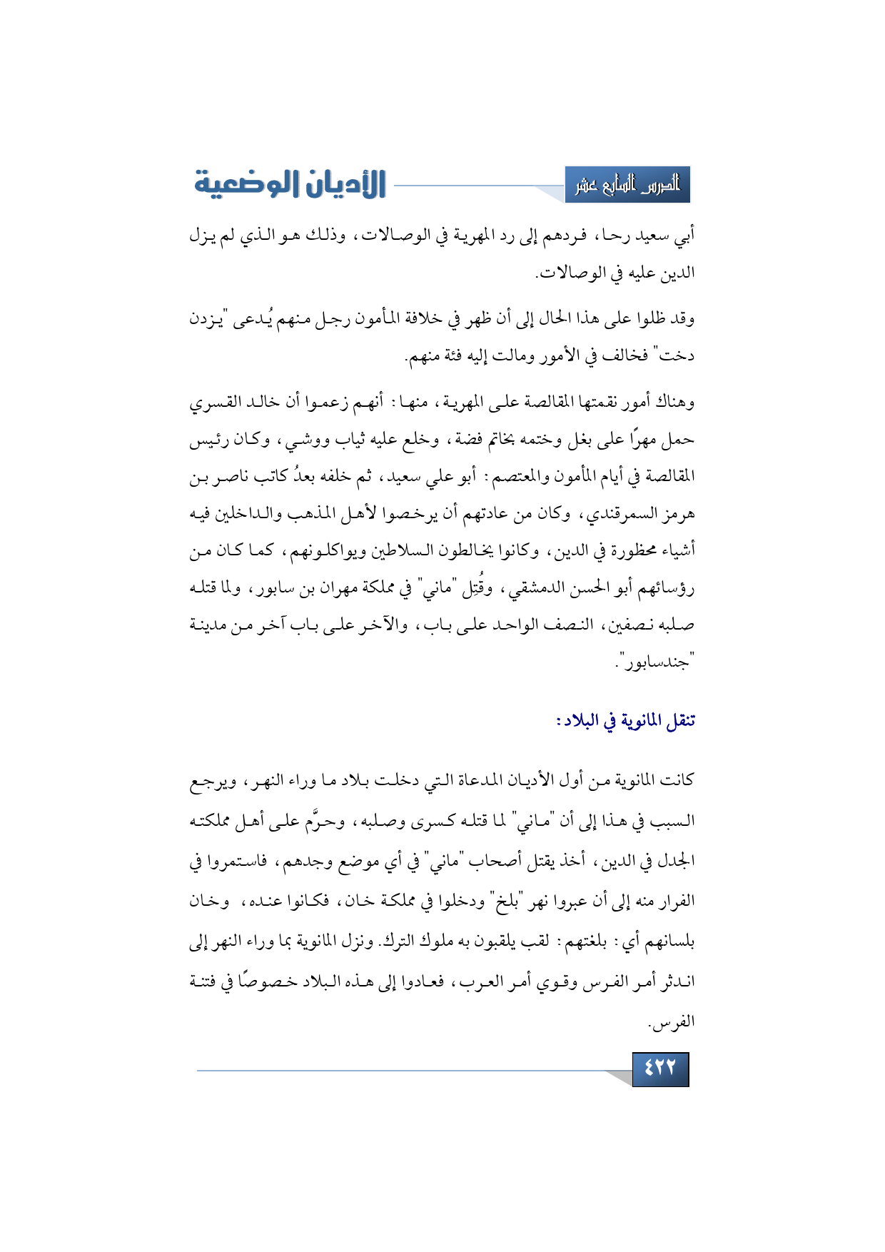 كانت المانوية من أول الأديان المدعاة التي دخلت بلاد ما وراء النهر، ويرجع السبب في هذا إلى أن "ماني" لما قتله كسرى وصلبه، وحرَّم على أهل مملكته الجدل في الدين، أخذ يقتل أصحاب "ماني" في أي موضع وجدهم، فاستمروا في الفرار منه إلى أن عبروا نهر "بلخ" ودخلوا في مملكة خان، فكانوا عنده، وخان بلسانهم -أي: بلغتهم- لقب يلقبون به ملوك الترك. وحين نزل المانوية بما وراء النهر إلى اندثر أمر الفرس وقوي أمر العرب، فعادوا إلى هذه البلاد خصوصًا في فتنة الفرس.