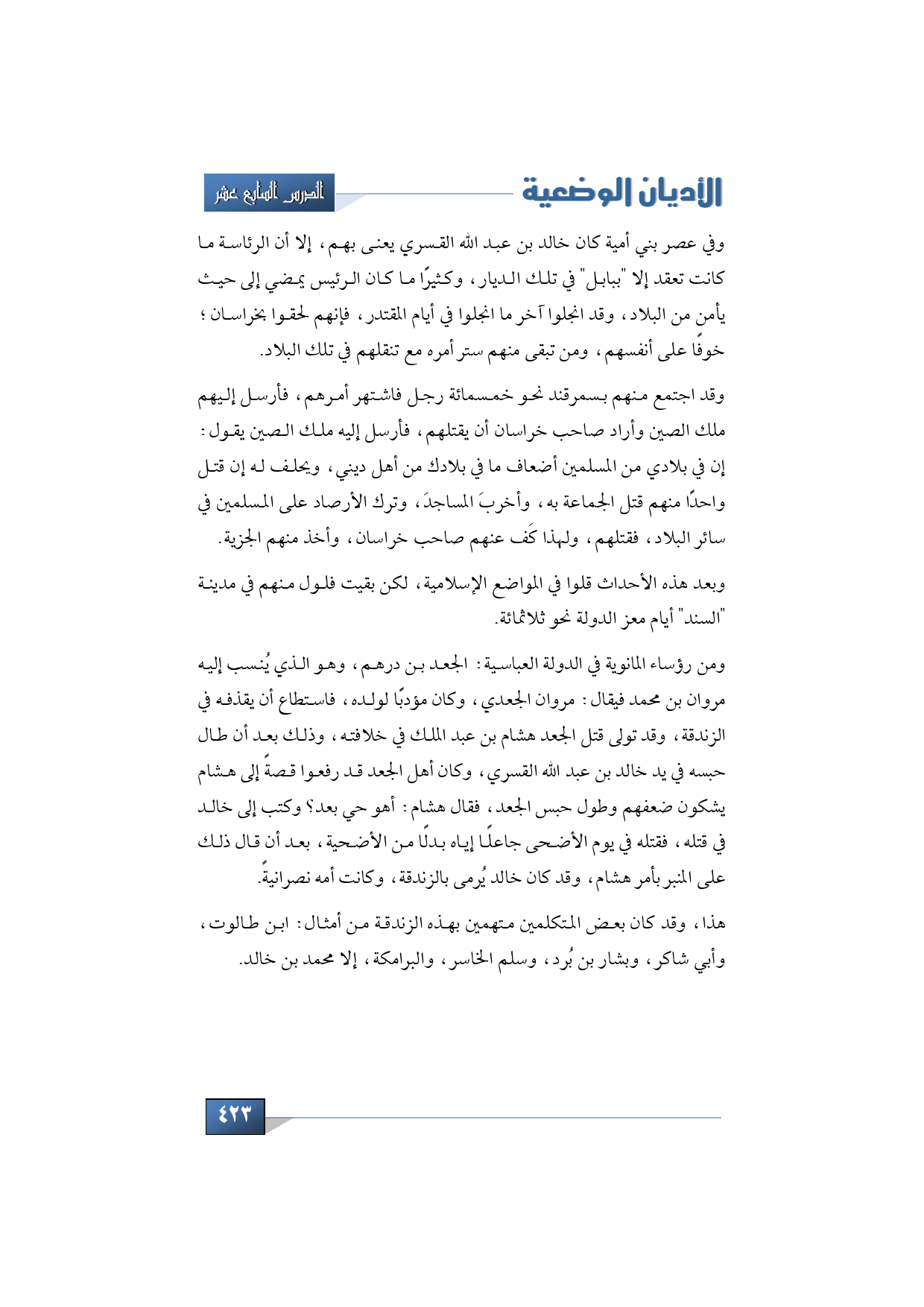 ومن رؤساء المانوية في الدولة العباسية، من هؤلاء الجعد بن درهم، وهو الذي يُنسب إليه مروان بن محمد فيقال: مروان الجعدي، وكان مؤدبًا له ولده، فاستطاع أن يقذفه في الزندقة، وقد تولى قتل الجعد هشام بن عبد الملك في خلافته، وذلك بعد أن طال حبسه في يد خالد بن عبد الله القسري، وكان أهل الجعد قد رفعوا قصةً إلى هشام يشكون ضعفهم وطول حبس الجعد، فقال هشام: أهو حي بعد؟ وكتب إلى خالد في قتله، فقتله يوم أضحى جاعلًا إياه بدلًا من الأضحية، بعد أن قال ذلك على المنبر بأمر هشام، وقد كان خالد يُرمى بالزندقة، وكانت أمه نصرانيةً.