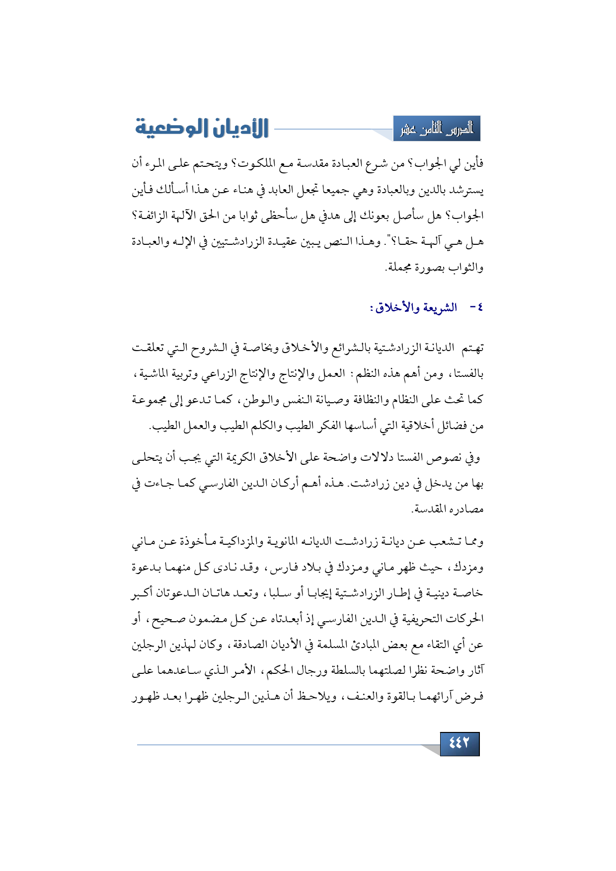 والأقوال هي: "أرجو منك أيها الرب الخالق المطلق القدير أن تغفر لي ما ارتكبت من سيئات وما دار بخلدي من تفكير سيئ، وما صدر عني من قول أو عمل غير صالح. إلهي أرجو منك أن تباعد بيني وبين خطاياي حتى أحشد يوم الدين مع الأطهار الأخيار". وفي مجوسية الفرس المتأخرة نلحظ تقديسا وتعظيما للنار، فلا ينبغي للنار أن تطفأ ولا يوقع عليها ماء ولا تصلها أشعة الشمس والبيت الطيب هو الذي توقد فيه نار ولا يخلو معبد منها، وكانت المعابد تسمى بها وتعرف باسم هيكل النار، ورجال الدين الفارسي يسمون بالموابذة وعملهم الوعظ والتدريس والتعليم، ولهم منزلة كبيرة في المجتمع ولهم معاونون يعرفون بالموابذة، وهو معينون لإقامة الشعائر في المعابد وحراسة النار والمحافظة عليها.