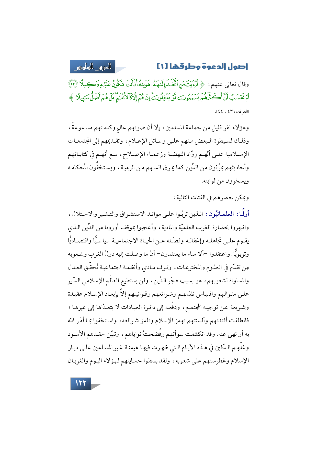 وهؤلاء نفر قليل من جماعة المسلمين، إلاّ أن صوتهم عالٍ وكلمتهم مسموعةٌ، وذلك لسيطرة البعض منهم على وسائل الإعلام، وتقديمهم إلى المجتمعات الإسلامية على أنّهم رواد النهضة وزعماء الإصلاح، مع أنهم في كتاباتهم وأحاديثهم يمرُقون من الدِّين كما يمرق السهم من الرمية، ويستخفُّون بأحكامه ويسخرون من ثوابته. وهم يمكن حصرهم في الفئات التالية: