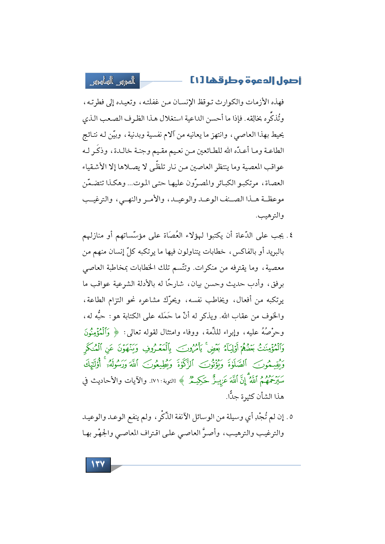 3 - يجب على الدّعاة أن يكتبوا لهؤلاء العصاة على مؤسّساتهم أو منازلهم بالبريد أو بالفاكس، خطابات يتناولون فيها ما يرتكبه كلّ إنسان منهم من معصية، وما يقترفه من منكرات. وتتّسم تلك الخطابات بمخاطبة العاصي برفق، وأدب حديث وحسن بيان، شارحاً له بالأدلة الشرعية عواقب ما يرتكبه من أفعال، ويخاطب نفسه، ويحرّك مشاعره نحو التزام الطاعة، والخوف من عقاب الله. ويذكر له أنّ ما حَمَله على الكتابة هو: حبُّه له، وحرْصُهُ عليه، وإبراءٌ للذِّمة، ووفاء وامتثال لقوله تعالى: {وَالْمُؤْمِنُونَ وَالْمُؤْمِنَاتُ بَعْضُهُمْ أَوْلِيَاءُ بَعْضٍ يَأْمُرُونَ بِالْمَعْرُوفِ وَيَنْهَوْنَ عَنِ الْمُنْكَرِ وَيُقِيمُونَ الصَّلاَةَ وَيُؤْتُونَ الزَّكَاةَ وَيُطِيعُونَ اللَّهَ وَرَسُولَهُ أُولَئِكَ سَيَرْحَمُهُمُ اللَّهُ إِنَّ اللَّهَ عَزِيزٌ حَكِيمٌ} (التوبة:71).