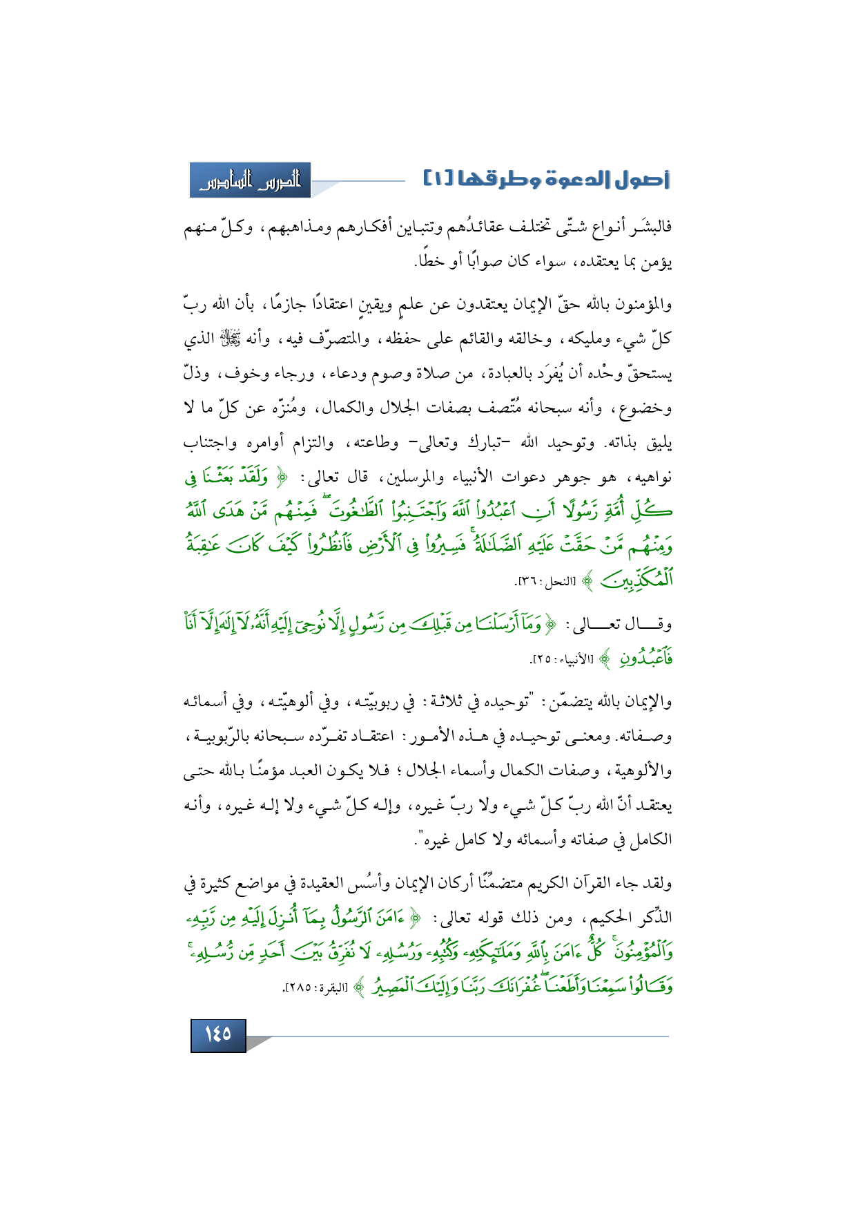 ولقد جاء القرآن الكريم متضمِّناً أركان الإيمان وأسُس العقيدة في مواضع كثيرة في الذِّكر الحكيم، ومن ذلك قوله تعالى: {آمَنَ الرَّسُولُ بِمَا أُنْزِلَ إِلَيْهِ مِنْ رَبِّهِ وَالْمُؤْمِنُونَ كُلٌّ آمَنَ بِاللَّهِ وَمَلائِكَتِهِ وَكُتُبِهِ وَرُسُلِهِ لاَ نُفَرِّقُ بَيْنَ أَحَدٍ مِنْ رُسُلِهِ وَقَالُوا سَمِعْنَا وَأَطَعْنَا غُفْرَانَكَ رَبَّنَا وَإِلَيْكَ الْمَصِيرُ} (البقرة:285).