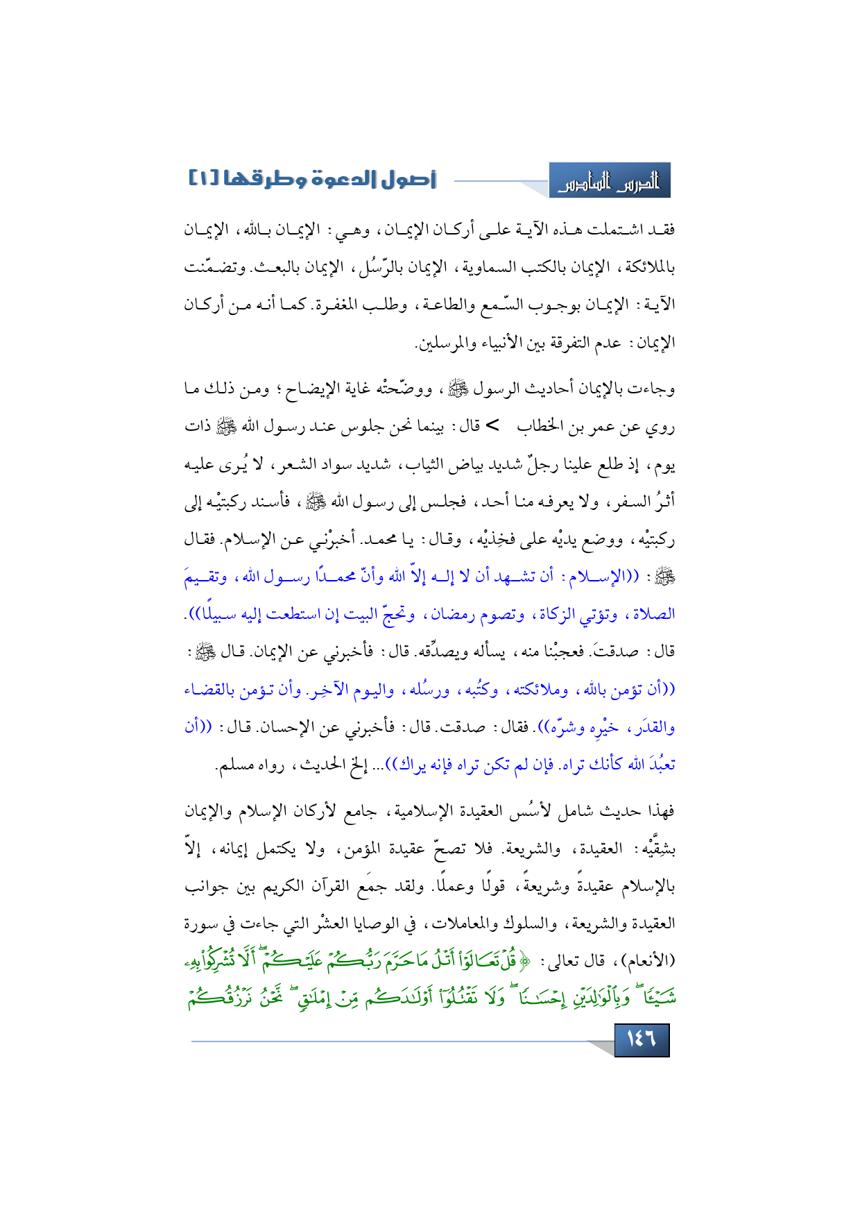 فهذا حديث شامل لأسُس العقيدة الإسلامية، جامع لأركان الإسلام والإيمان بشِقَّيْه: العقيدة، والشريعة. فلا تصحّ عقيدة المؤمن، ولا يكتمل إيمانه، إلاّ بالإيمان بالإسلام عقيدة وشريعة، قولاً وعملاً. ولقد جمَع القرآن الكريم بين جوانب العقيدة والشريعة، والسلوك والمعاملات، في الوصايا العشْر التي جاءت في سورة (الأنعام)، قال تعالى: {قُلْ تَعَالَوْا أَتْلُ مَا حَرَّمَ رَبُّكُمْ عَلَيْكُمْ أَلاَّ تُشْرِكُوا بِهِ شَيْئاً وَبِالْوَالِدَيْنِ إِحْسَاناً وَلاَ تَقْتُلُوا أَوْلادَكُمْ مِنْ إِمْلاقٍ نَحْنُ نَرْزُقُكُمْ