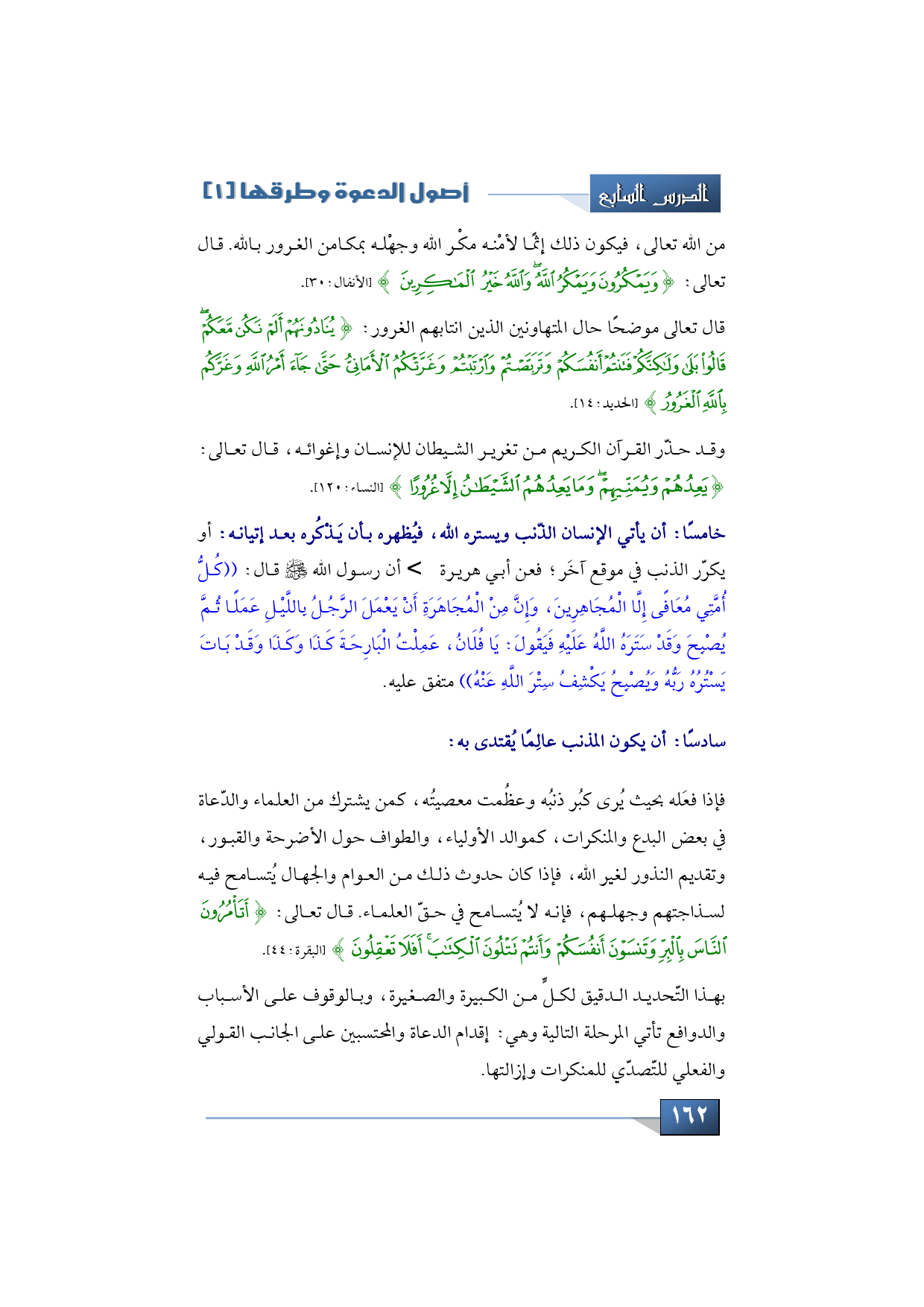 سادساً: أن يكون المذنب عالِماً يُقتدى به؛ فإذا فعَله بحيث يُرى، كبُر ذنبُه وعظُمت معصيتُه، كمن يشترك من العلماء والدّعاة في بعض البدع والمنكرات، كموالد الأولياء، والطواف حول الأضرحة والقبور، وتقديم النذور لغير الله، فإذا كان حدوث ذلك من العوام والجهال يُتسامح فيه لسذاجتهم وجهلهم، فإنه لا يُتسامح في حقّ العلماء. قال تعالى: {أَتَأْمُرُونَ النَّاسَ بِالْبِرِّ وَتَنْسَوْنَ أَنْفُسَكُمْ وَأَنْتُمْ تَتْلُونَ الْكِتَابَ أَفَلاَ تَعْقِلُونَ} (البقرة:44).