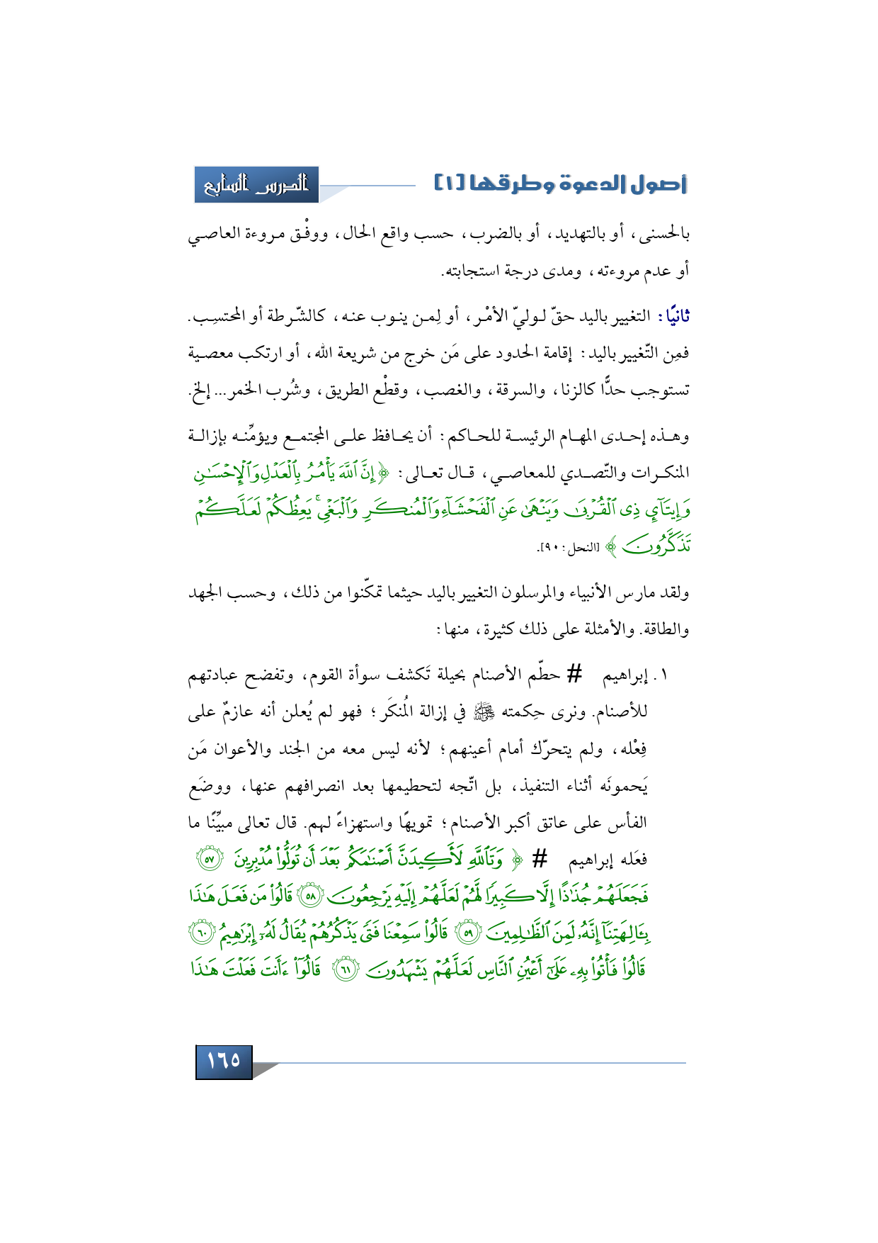 1 - إبراهيم -عليه السلام- حطّم الأصنام بحيلة تَكشف سوأة القوم، وتفضح عبادتهم للأصنام. ونرى حِكمته -عليه الصلاة والسلام- في إزالة المُنكَر؛ فهو لم يُعلن أنه عازمٌ على فِعْله، ولم يتحرّك أمام أعينهم، لأنه ليس معه من الجند والأعوان مَن يَحمونَه أثناء التنفيذ، بل اتّجه لتحطيمها بعد انصرافهم عنها، ووضَع الفأس على عاتق أكبر الأصنام تمويهاً واستهزاءً لهم. قال تعالى مبيِّناً ما فعَله إبراهيم -عليه السلام-: {وَتَاللَّهِ لأَكِيدَنَّ أَصْنَامَكُمْ بَعْدَ أَنْ تُوَلُّوا مُدْبِرِينَ * فَجَعَلَهُمْ جُذَاذاً إِلاَّ كَبِيراً لَهُمْ لَعَلَّهُمْ إِلَيْهِ يَرْجِعُونَ * قَالُوا مَنْ فَعَلَ هَذَا بِآلِهَتِنَا إِنَّهُ لَمِنَ الظَّالِمِينَ * قَالُوا سَمِعْنَا فَتىً يَذْكُرُهُمْ يُقَالُ لَهُ إِبْرَاهِيمُ * قَالُوا فَأْتُوا بِهِ عَلَى أَعْيُنِ النَّاسِ لَعَلَّهُمْ يَشْهَدُونَ * قَالُوا أَأَنْتَ فَعَلْتَ هَذَا