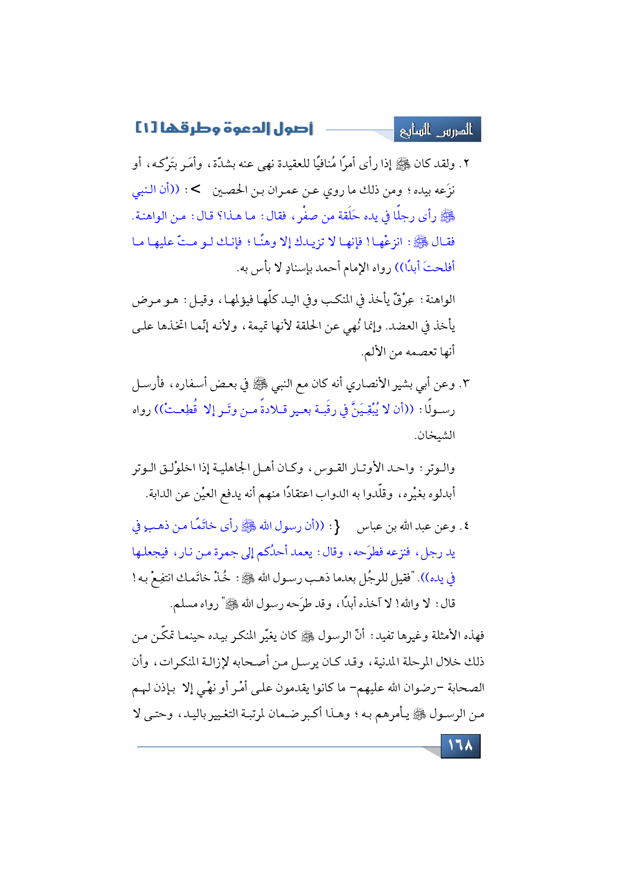 ولقد كان -صلى الله عليه وسلم- إذا رأى أمراً مُنافياً للعقيدة، نهى عنه بشدّة، وأمَر بتَرْكه، أو نزَعه بيده؛ ومن ذلك ما روي عن عمران بن الحصين -رضي الله عنه-: ((أن النبي -صلى الله عليه وسلم- رأى رجلاً في يده حَلَقة من صفْر، فقال: ما هذا؟ قال: من الواهنة. فقال -صلى الله عليه وسلم-: انزعْها! فإنها لا تزيدك إلاّ وهناً؛ فإنك لو متّ عليها ما أفلحتَ أبداً))، رواه الإمام أحمد بإسناد لا بأس به.