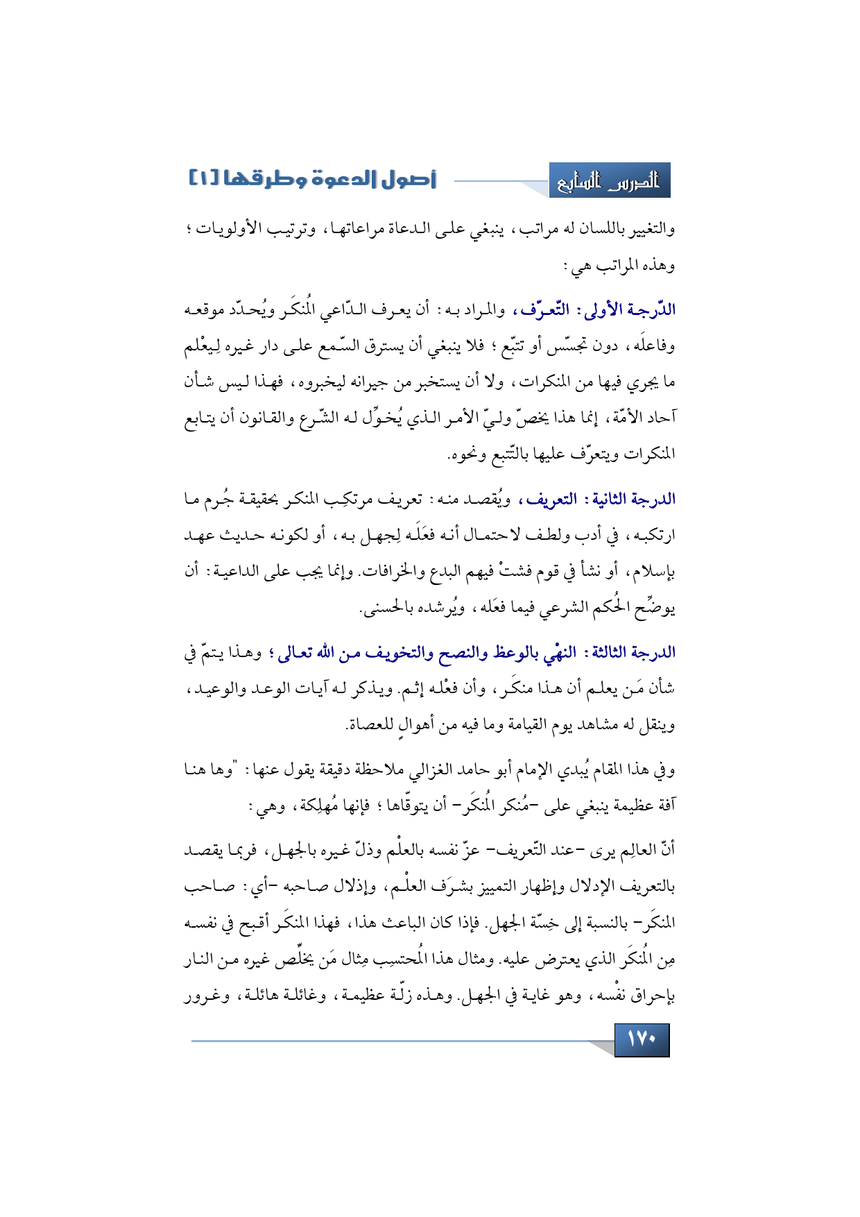 الدرجة الثالثة: النهْي بالوعظ والنصح والتخويف من الله تعالى؛ وهذا يتمّ في شأن مَن يعلم أن هذا منكَر، وأن فعْله إثم. ويذكر له آيات الوعد والوعيد، وينقل له مشاهد يوم القيامة وما فيه من أهوال للعصاة.