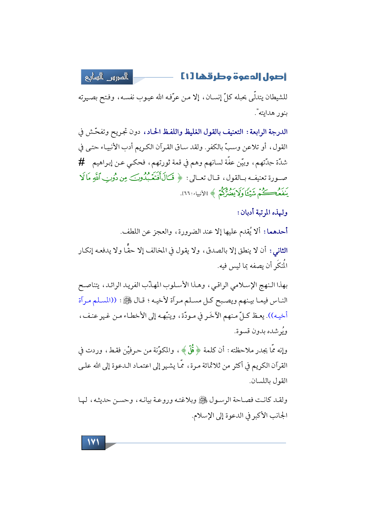 الدرجة الرابعة: التعنيف بالقول الغليظ واللفظ الحاد، دون تجريح وتفحّش في القول، أو تلاعن وسبّ بالكفر. ولقد ساق القرآن الكريم أدب الأنبياء حتى في شدّة حِدّتهم، وبيّن عفّة لسانهم وهم في قمة ثورتهم، فحكى عن إبراهيم -عليه السلام- صورة تعنيفه بالقول، قال تعالى: {قَالَ أَفَتَعْبُدُونَ مِنْ دُونِ اللَّهِ مَا لا يَنْفَعُكُمْ شَيْئاً وَلا يَضُرُّكُمْ} (الأنبياء:66).