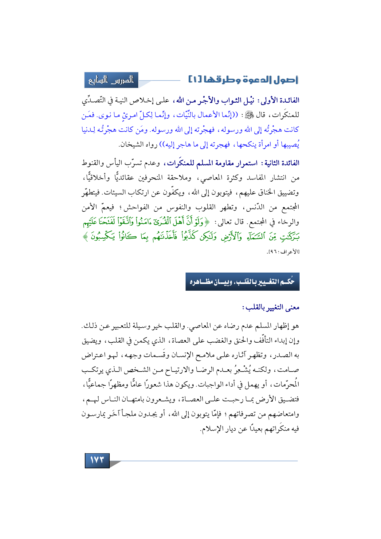 الفائدة الأولى: نيْل الثواب والأجْر من الله، على إخلاص النية في التّصدِّي للمنكَرات، قال -صلى الله عليه وسلم-: ((إنّما الأعمال بالنِّيّات، وإنّما لِكلّ امرئٍ ما نوى. فمَن كانت هجْرتُه إلى الله ورسوله، فهجْرته إلى الله ورسوله. ومَن كانت هجْرتُه لِدنيا يُصيبها أو امرأة ينكحها، فهجرته إلى ما هاجر إليه))، رواه الشيخان.