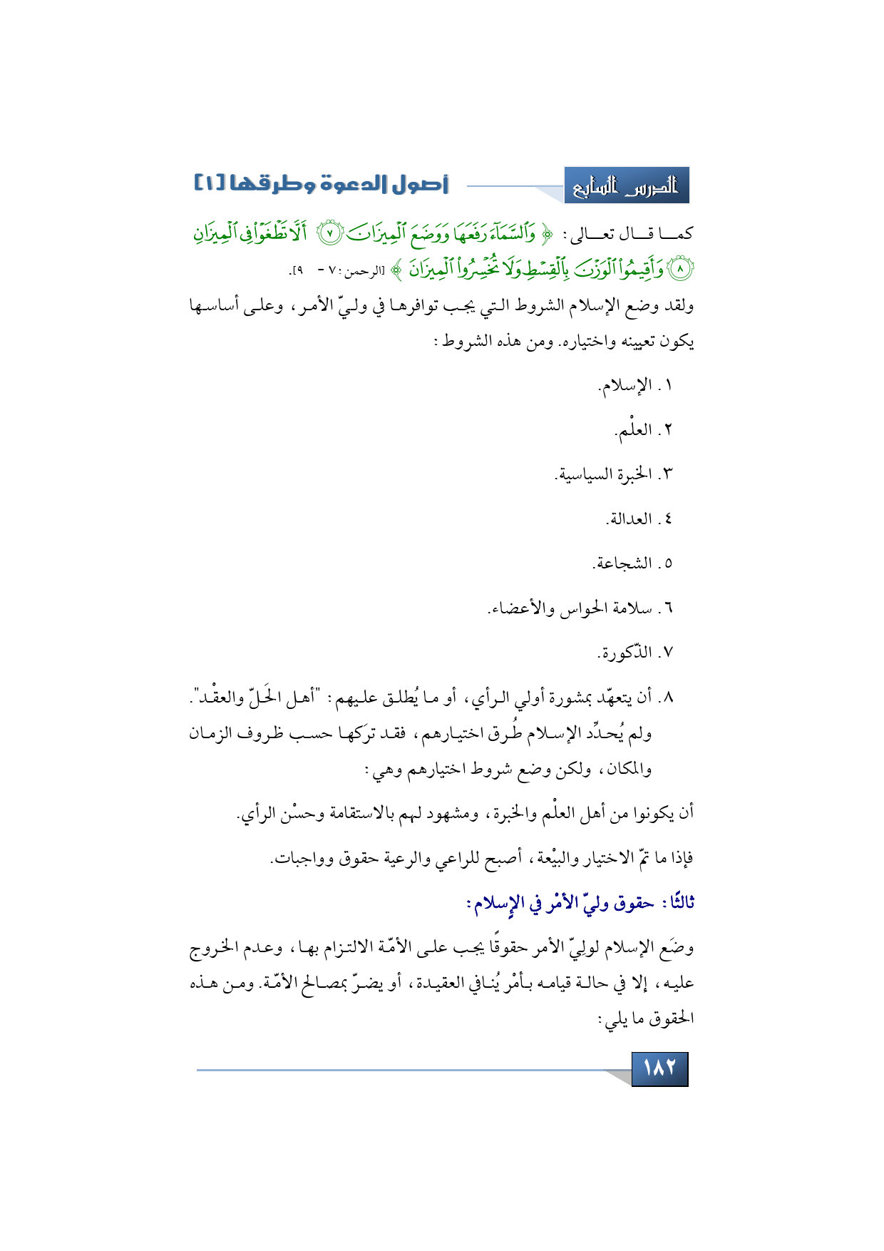 8 - أن يتعهّد بمشورة أولي الرأي، أو ما يُطلق عليهم: "أهل الحَلّ والعقْد". ولم يُحدِّد الإسلام طُرق اختيارهم، فقد ترَكها حسب ظروف الزمان والمكان، ولكن وضع شروط اختيارهم وهي: