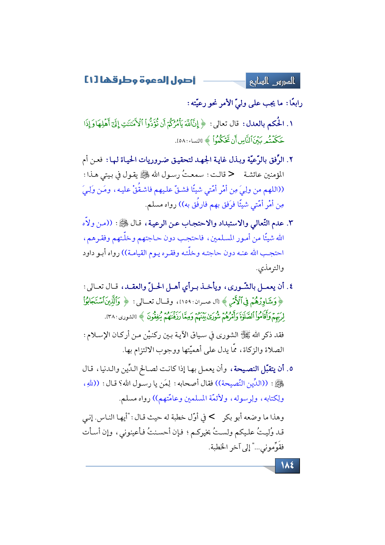 1 - الحُكم بالعدل قال تعالى: {إِنَّ اللَّهَ يَأْمُرُكُمْ أَنْ تُؤَدُّوا الأَمَانَاتِ إِلَى أَهْلِهَا وَإِذَا حَكَمْتُمْ بَيْنَ النَّاسِ أَنْ تَحْكُمُوا بِالْعَدْلِ} (النساء:58).