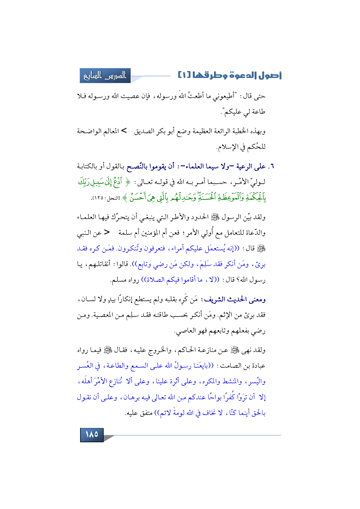 6 - على الرعية -ولا سيما العلماء-: أن يقوموا بالنّصح بالقول أو بالكتابة لوليّ الأمْر، حسبما أمر به الله في قوله تعالى: {ادْعُ إِلَى سَبِيلِ رَبِّكَ بِالْحِكْمَةِ وَالْمَوْعِظَةِ الْحَسَنَةِ وَجَادِلْهُمْ بِالَّتِي هِيَ أَحْسَنُ} (النحل:125).