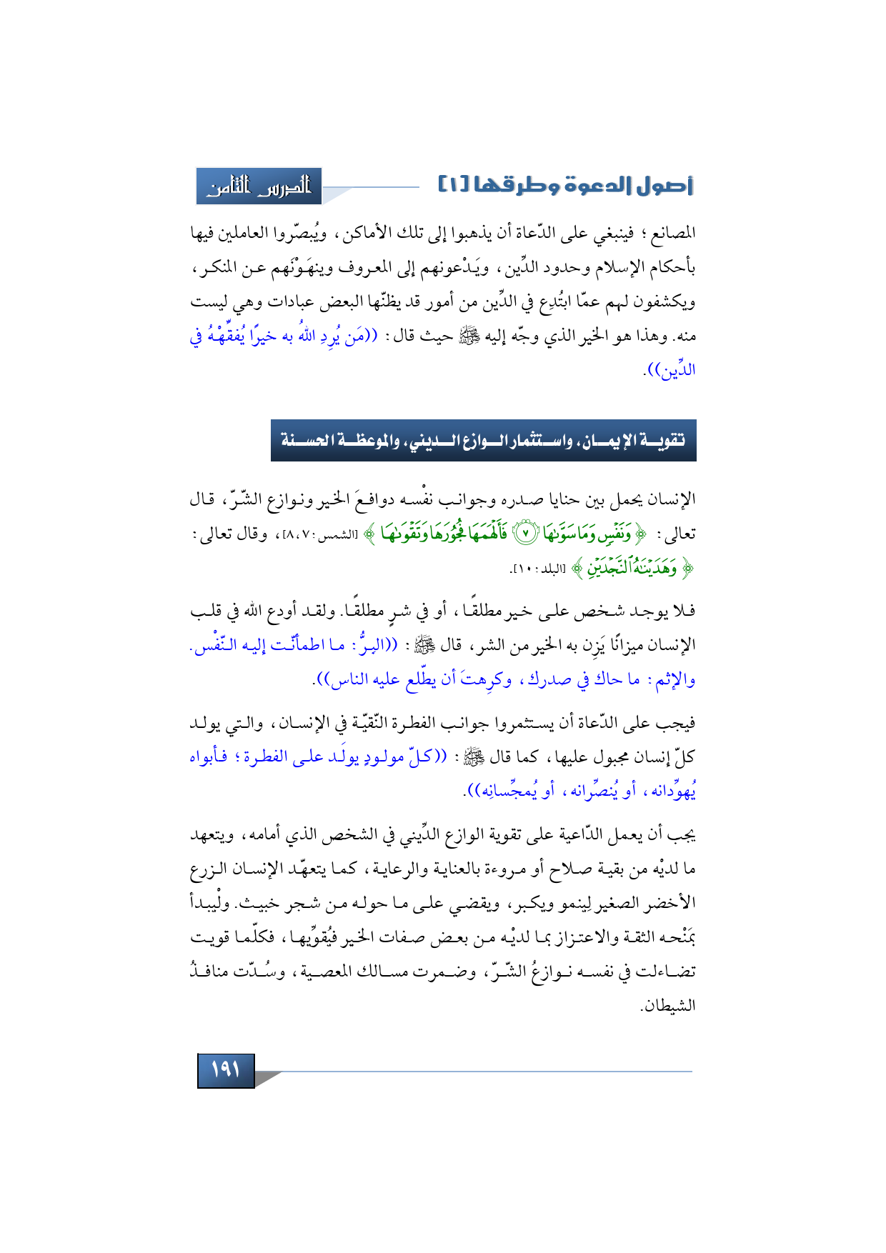 فيجب على الدّعاة أن يستثمروا جوانب الفطرة النّقيّة في الإنسان، والتي يولد كلّ إنسان مجبول عليها، كما قال -صلى الله عليه وسلم-: ((كلّ مولودٍ يولَد على الفطرة؛ فأبواه يُهوِّدانه، أو يُنصِّرانه، أو يُمجِّسانِه)).
