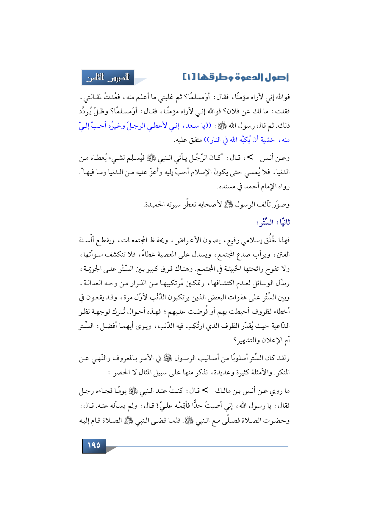 فوالله إني لأراه مؤمناً، فقال: أو مسلماً. وظلّ يُردِّد ذلك. ثم قال رسول الله -صلى الله عليه وسلم-: يا سعد. إني لأعطي الرجلَ وغيرُه أحبّ إليّ منه، خشية أن يُكبَّه الله في النار))، متفق عليه.