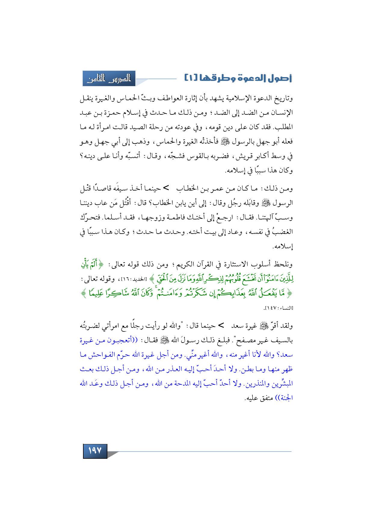 وتاريخ الدعوة الإسلامية يشهد بأن إثارة العواطف وبثّ الحماس والغيرة ينقل الإنسان من الضد إلى الضد؛ ومن ذلك: ما حدث في إسلام حمزة بن عبد المطلب. فقد كان على دين قومه، وفي عودته من رحلة الصيد، قالت امرأة له ما فعله أبو جهل بالرسول -صلى الله عليه وسلم-، فأخذتْه الغيرة والحماس، وذهب إلى أبي جهل وهو في وسط أكابر قريش، فضربه بالقوس فشجّه، وقال: أتسبّه وأنا على دينه؟ وكان هذا سبباً في إسلامه.