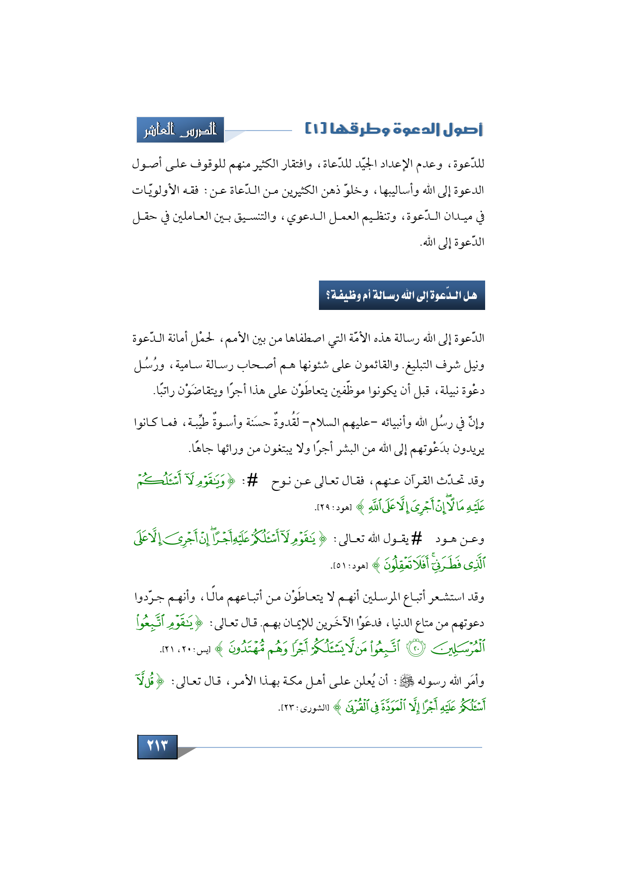 الدّعوة إلى الله رسالة هذه الأمّة التي اصطفاها من بين الأمم، لحمْل أمانة الدّعوة ونيل شرف التبليغ. والقائمون على شؤونها هم أصحاب رسالة سامية، ورُسُل دعْوة نبيلة، قبل أن يكونوا موظّفين يتعاطَوْن على هذا أجراً ويتقاضَوْن راتباً.