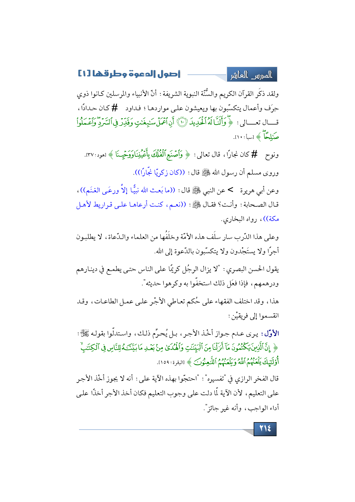 الأوّل: يرى عدم جواز أخْذ الأجر، بل يُحرِّم ذلك، واستدلّوا بقوله -سبحانه وتعالى-: {إِنَّ الَّذِينَ يَكْتُمُونَ مَا أَنْزَلْنَا مِنَ الْبَيِّنَاتِ وَالْهُدَى مِنْ بَعْدِ مَا بَيَّنَّاهُ لِلنَّاسِ فِي الْكِتَابِ أُولَئِكَ يَلْعَنُهُمُ اللَّهُ وَيَلْعَنُهُمُ اللاَّعِنُونَ} (البقرة:159).