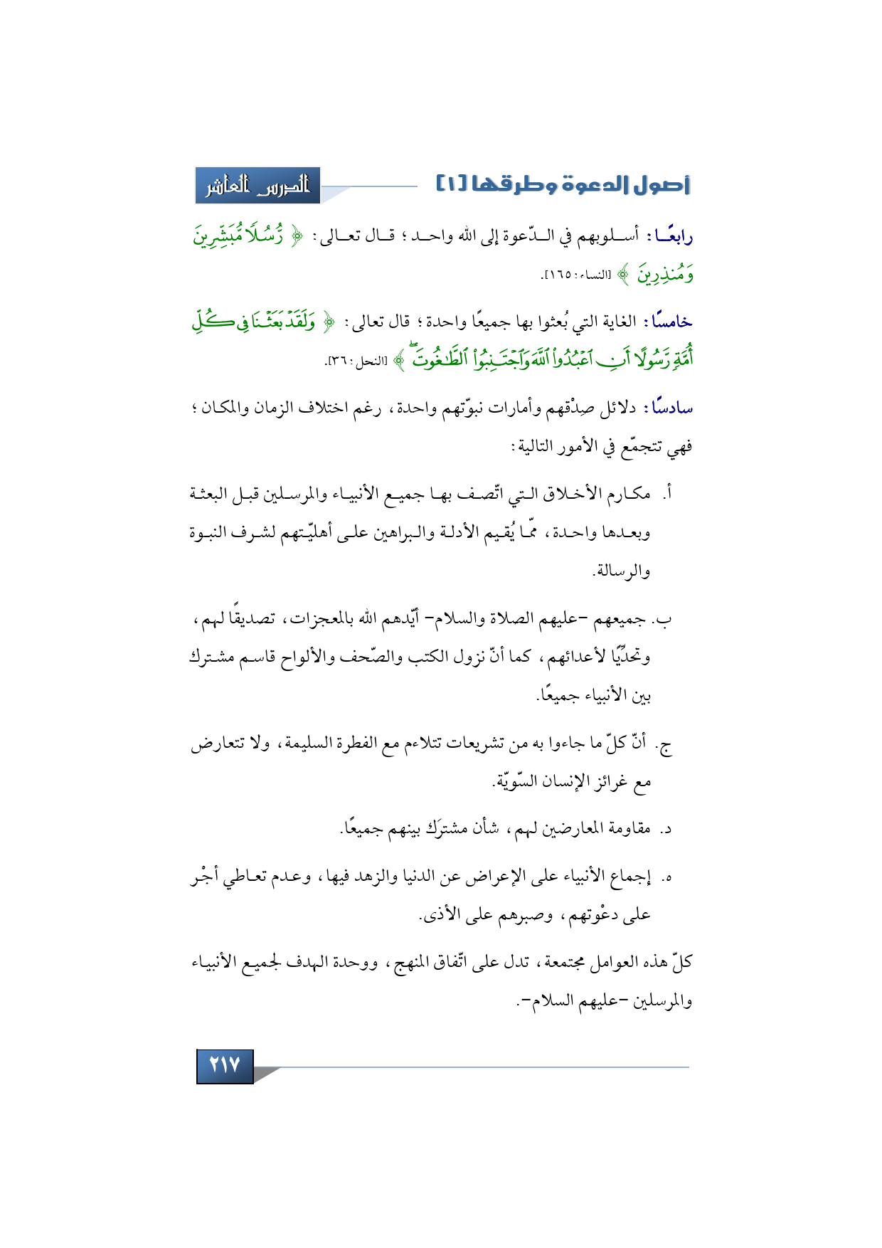 خامساً: الغاية التي بُعثوا بها جميعاً واحدة؛ قال تعالى: {وَلَقَدْ بَعَثْنَا فِي كُلِّ أُمَّةٍ رَسُولاً أَنِ اعْبُدُوا اللَّهَ وَاجْتَنِبُوا الطَّاغُوتَ} (النحل:36).