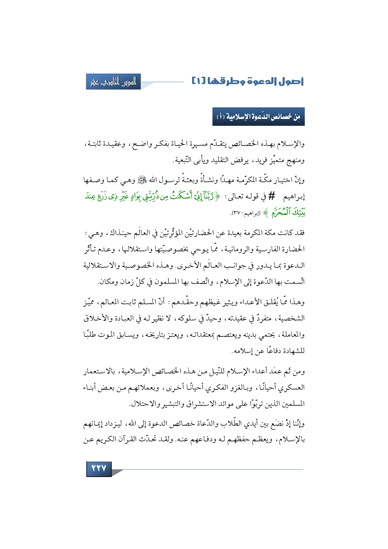 وإنّنا إذْ نضَع بين أيدي الطّلاب والدّعاة خصائص الدعوة إلى الله، ليزداد إيمانهم بالإسلام، ويعظم حفظهم له ودفاعهم عنه. ولقد تحدّث القرآن الكريم عن