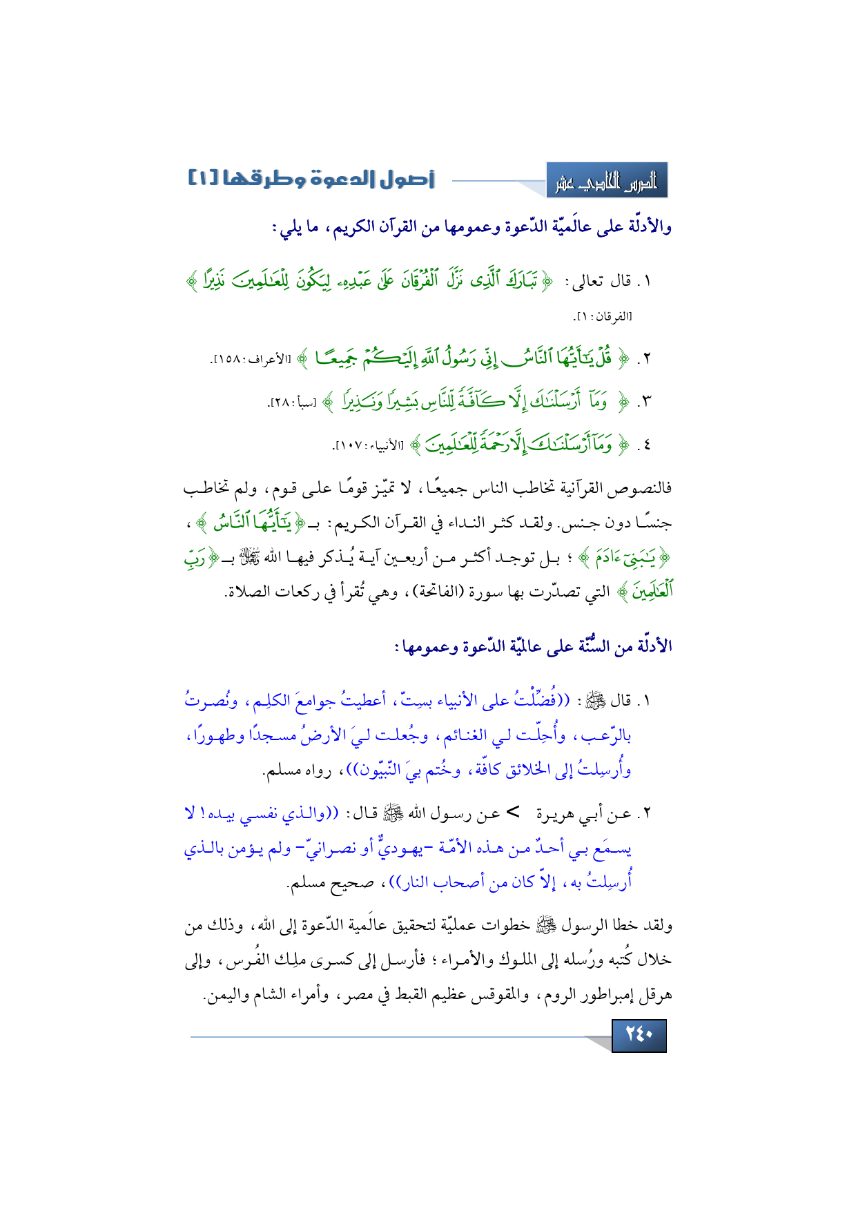 ولقد خطا الرسول -صلى الله عليه وسلم- خطوات عمليّة لتحقيق عالَمية الدّعوة إلى الله، وذلك من خلال كُتبه ورُسله إلى الملوك والأمراء؛ فأرسل إلى كسرى ملِك الفُرس، وإلى هرقل إمبراطور الروم، والمقوقس عظيم القبط في مصر، وأمراء الشام واليمن.