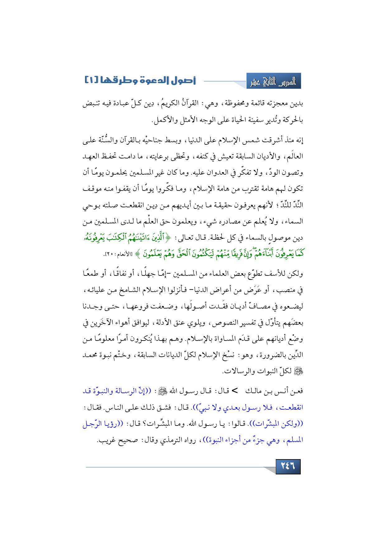 بدين معجزته قائمة ومحفوظة، وهي: القرآن الكريم، دِين كلّ عبادة فيه تنبض بالحركة وتُدير سفينة الحياة على الوجه الأمثل والأكمل.