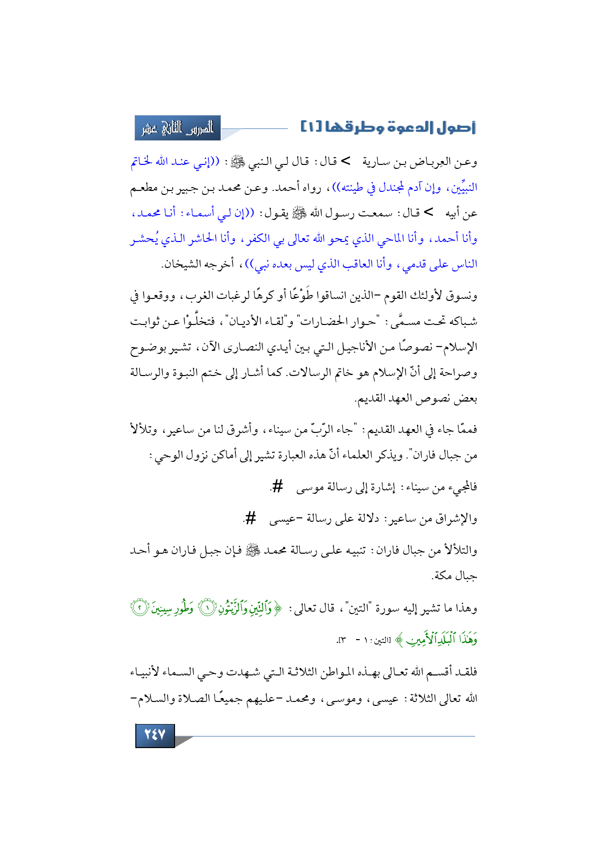 وهذا ما تشير إليه سورة (التين)، قال تعالى: {وَالتِّينِ وَالزَّيْتُونِ * وَطُورِ سِينِينَ * وَهَذَا الْبَلَدِ الأَمِينِ} (التين:1 - 3).