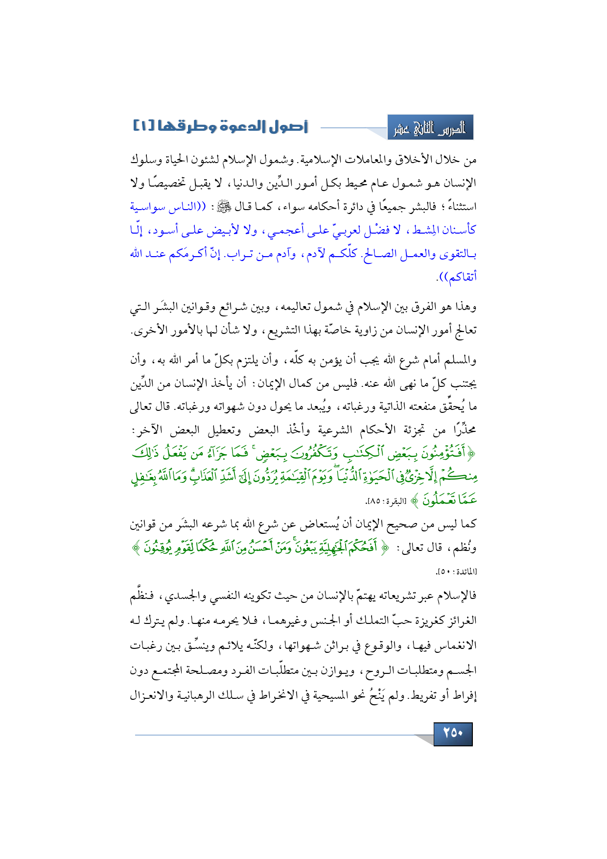 من خلال الأخلاق والمعاملات الإسلامية. وشمول الإسلام لشؤون الحياة وسلوك الإنسان هو شمول عام محيط بكل أمور الدِّين والدنيا، لا يقبل تخصيصاً ولا استثناءً؛ فالبشر جميعاً في دائرة أحكامه سواء، كما قال -صلى الله عليه وسلم-: ((الناس سواسية كأسنان المشط، لا فضْل لعربيّ على أعجمي، ولا لأبيض على أسود، إلاّ بالتقوى والعمل الصالح. كلّكم لآدم، وآدم من تراب. إنّ أكرمَكم عند الله أتقاكم)).