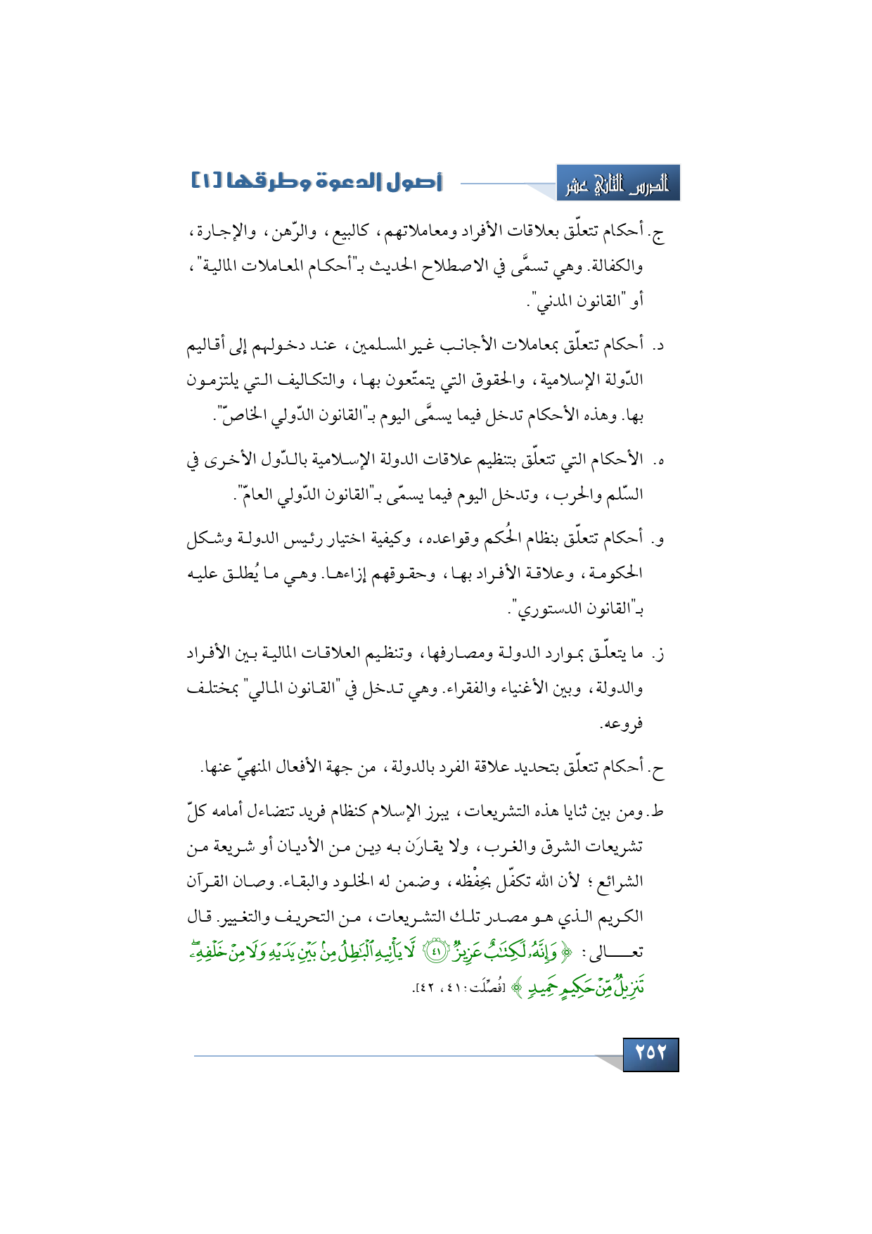 هـ- الأحكام التي تتعلّق بتنظيم علاقات الدولة الإسلامية بالدّول الأخرى في السّلم والحرب، وتدخل اليوم فيما يسمّى بـ"القانون الدّولي العامّ".