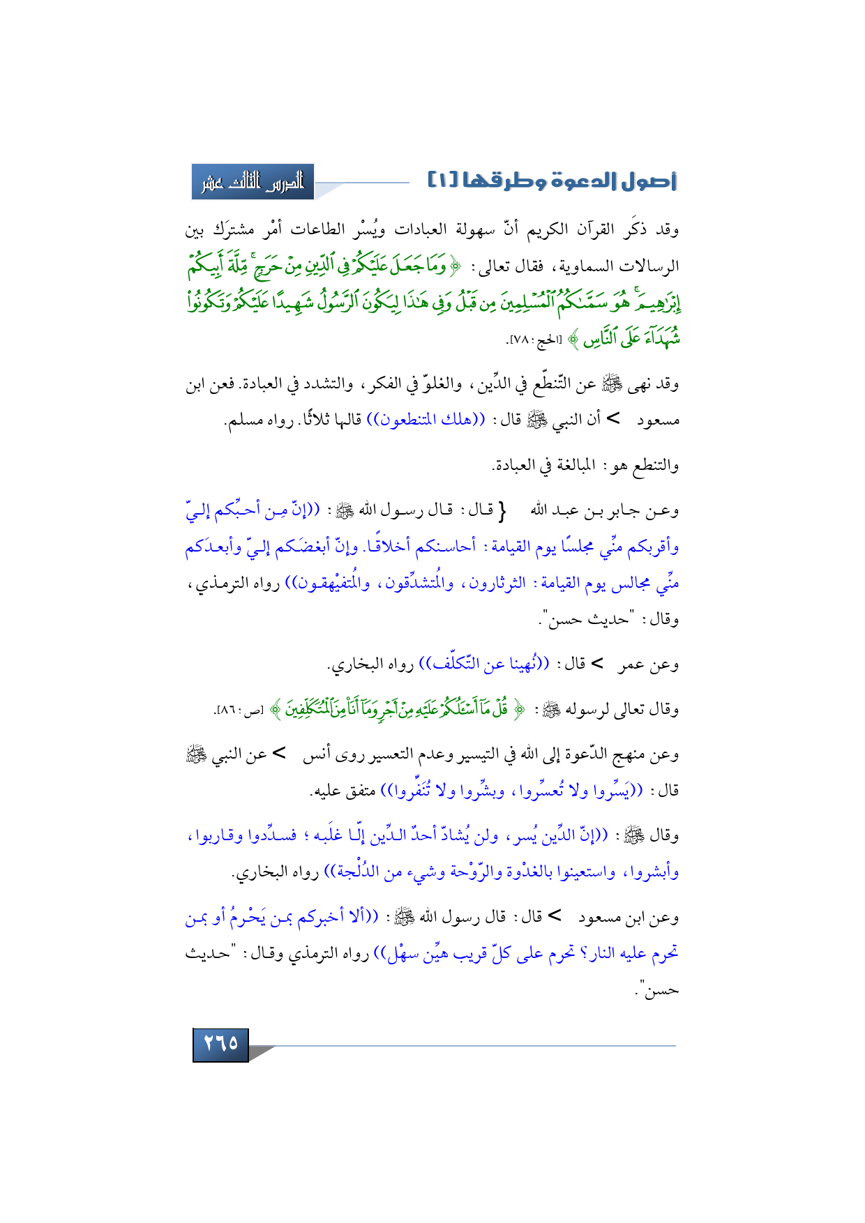 وعن منهج الدّعوة إلى الله في التيسير وعدم التعسير، روى أنس -رضي الله تعالى عنه- عن النبي -صلى الله عليه وسلم-، قال: ((يَسِّروا ولا تُعسِّروا، وبشِّروا ولا تُنَفِّروا))، متفق عليه.