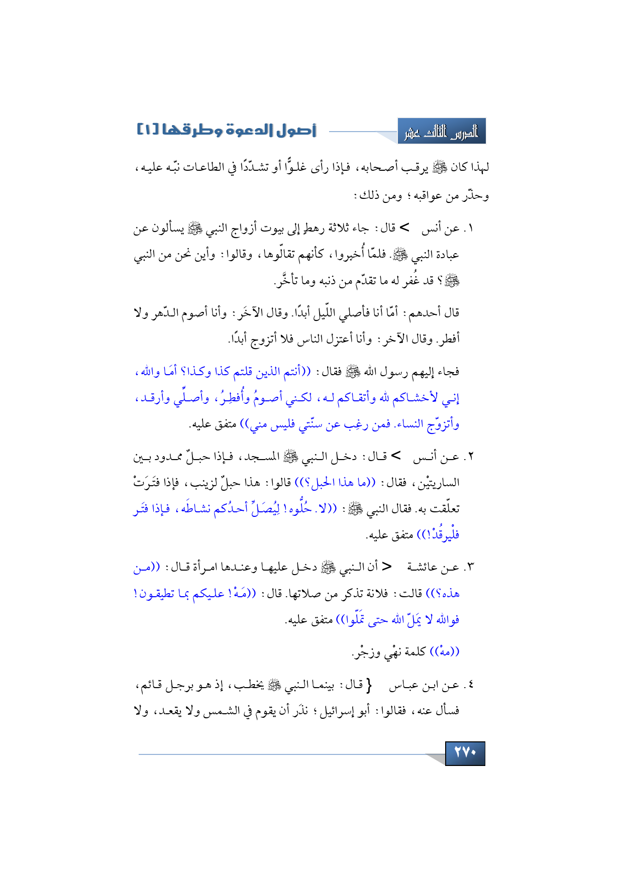 لهذا كان -صلى الله عليه وسلم- يرقب أصحابه، فإذا رأى غلواً أو تشدّداً في الطاعات نبّه عليه، وحذّر من عواقبه؛ ومن ذلك: