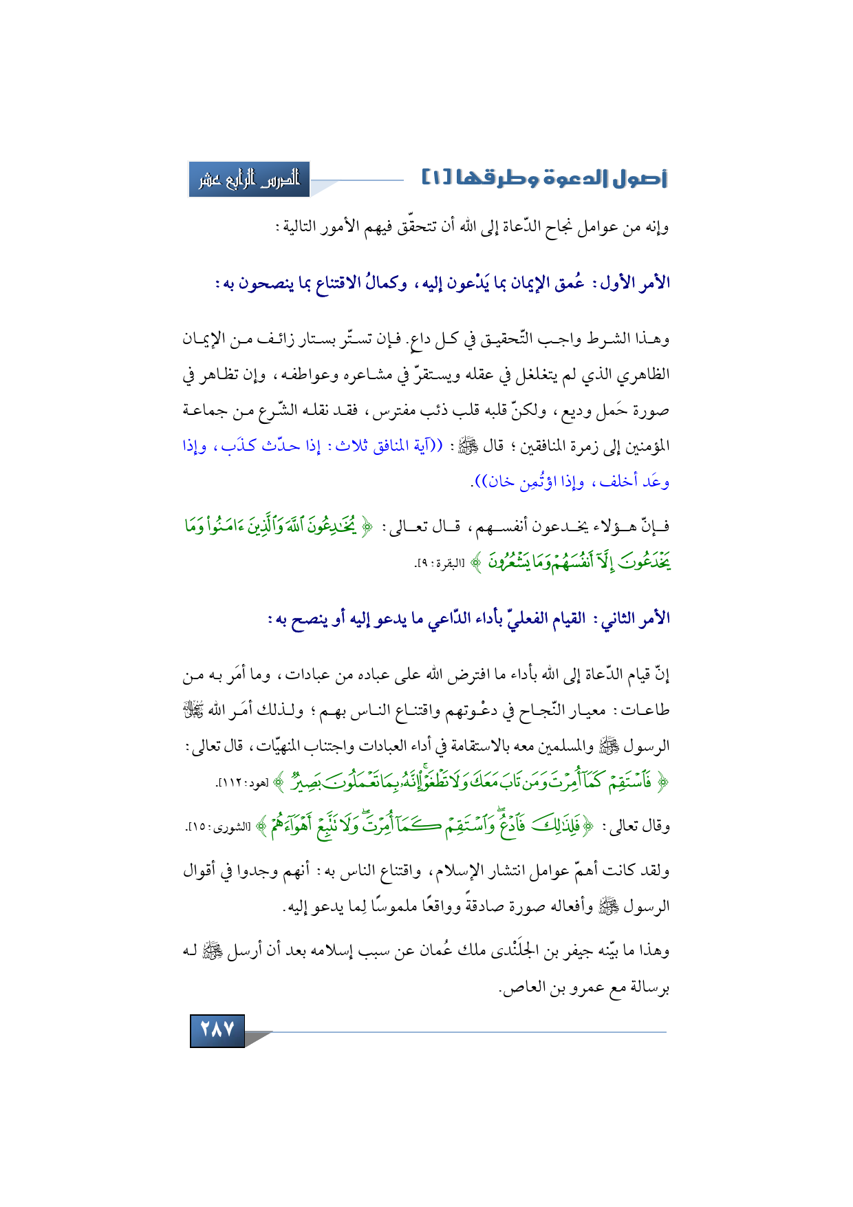 الأول: عُمق الإيمان بما يَدْعون إليه، وكمالُ الاقتناع بما ينصحون به. وهذا الشرط واجب التّحقيق في كل داعٍ. فإن تستّر بستار زائف من الإيمان الظاهري الذي لم يتغلغل في عقله ويستقرّ في مشاعره وعواطفه، وإن تظاهر في صورة حَمل وديع، ولكنّ قلبه قلب ذئب مفترس، فقد نقله الشّرع من جماعة المؤمنين إلى زمرة المنافقين؛ قال -صلى الله عليه وسلم-: ((آية المنافق ثلاث: إذا حدّث كذَب، وإذا وعَد أخلف، وإذا اؤتُمِن خان)).