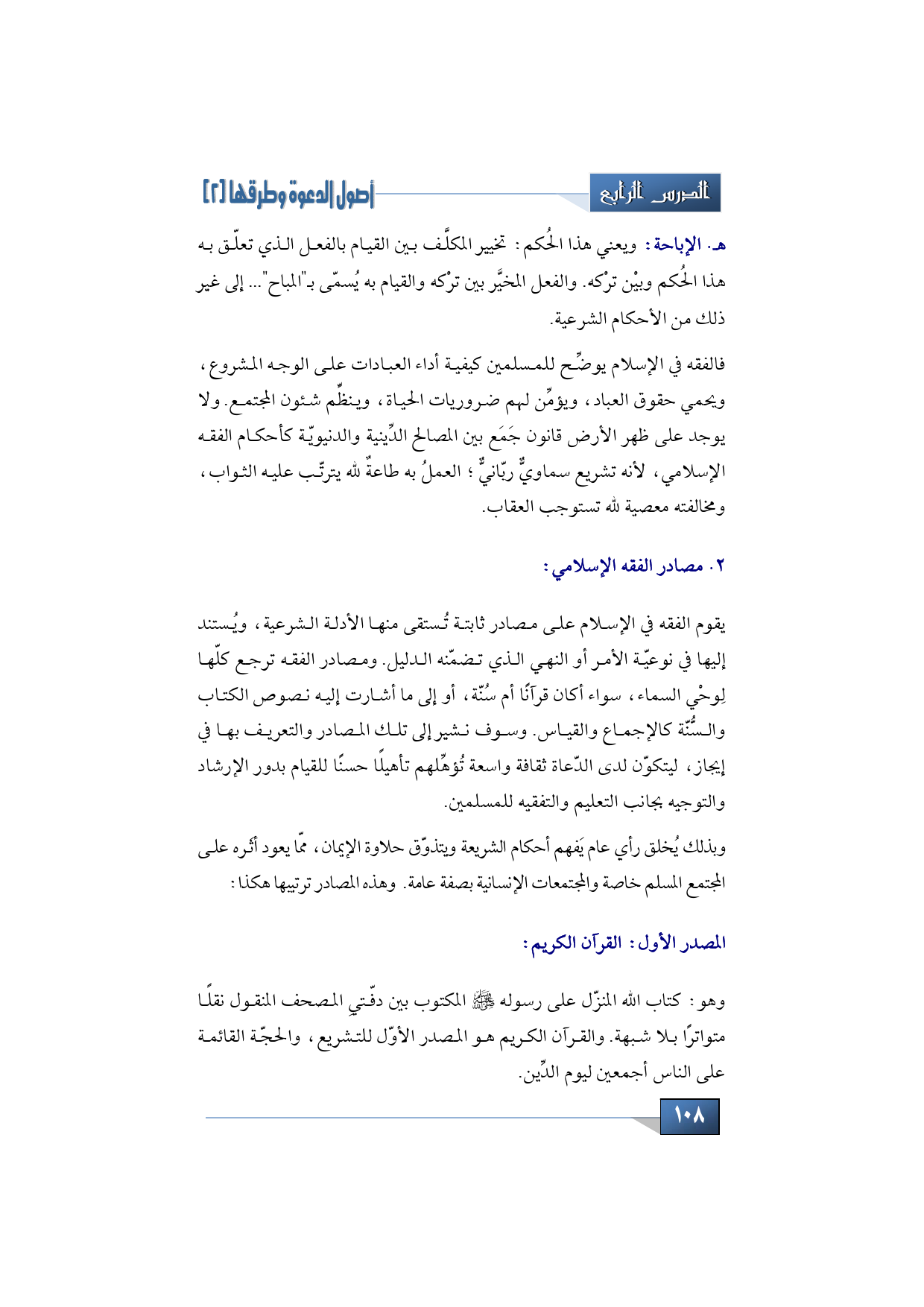يقوم الفقه في الإسلام على مصادر ثابتة تُستقى منها الأدلة الشرعية، ويُستند إليها في نوعيّة الأمر أو النهي الذي تضمّنه الدليل. ومصادر الفقه ترجع كلّها لِوحْي السماء، سواء أكان قرآناً أم سُنّة، أو إلى ما أشارت إليه نصوص الكتاب والسُّنّة كالإجماع والقياس. وسوف نشير إلى تلك المصادر والتعريف بها في إيجاز، ليتكوّن لدى الدّعاة ثقافة واسعة تُؤهِّلهم تأهيلاً حسناً للقيام بدور الإرشاد والتوجيه بجانب التعليم والتفقيه للمسلمين.