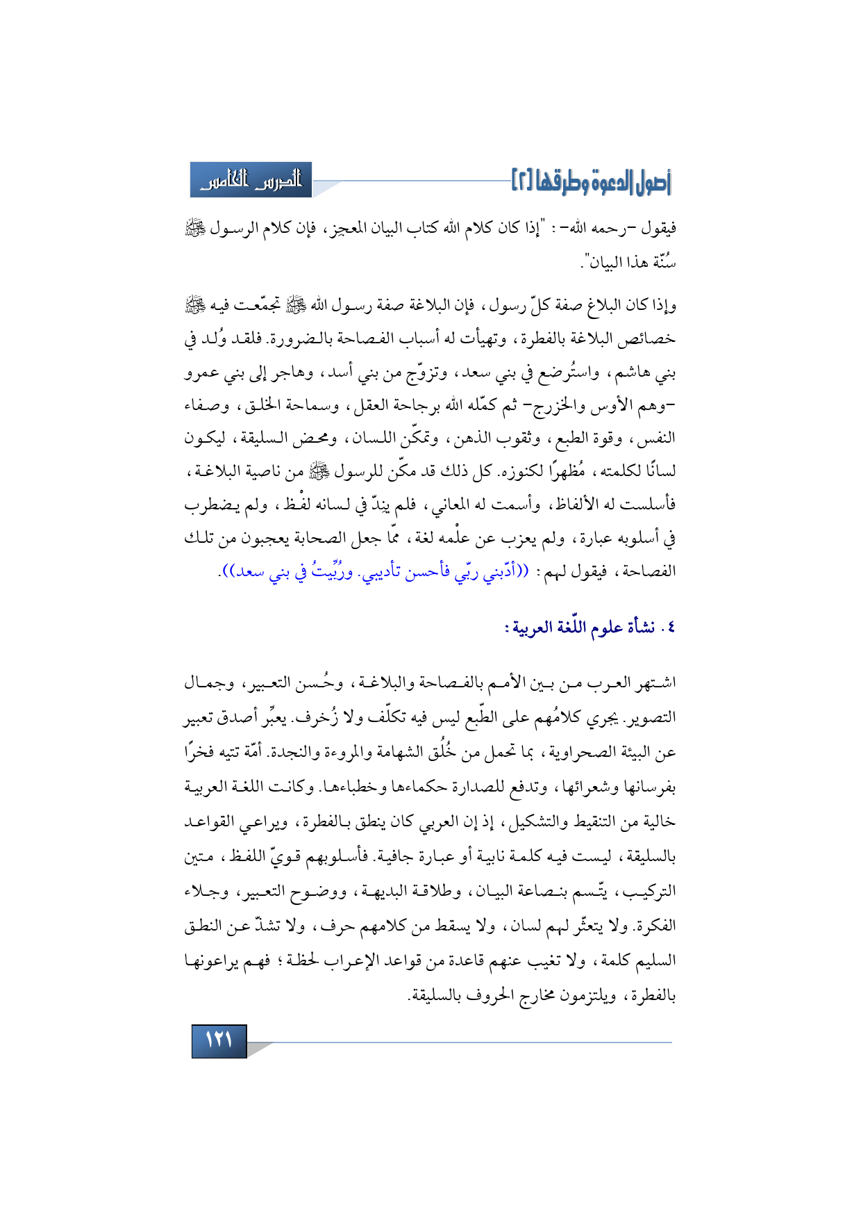 وإذا كان البلاغ صفة كلّ رسول، فإن البلاغة صفة رسول الله -صلى الله عليه وسلم-، تجمّعت فيه -صلى الله عليه وسلم- خصائص البلاغة بالفطرة، وتهيأت له أسباب الفصاحة بالضرورة. فلقد وُلد في بني هاشم، واستُرضع في بني سعد، وتزوّج من بني أسد، وهاجر إلى بني عمرو -وهم الأوس والخزرج-. ثم كمّله الله برجاحة العقل، وسماحة الخلق، وصفاء النفس، وقوة الطبع، وثقوب الذهن، وتمكّن اللسان، ومحض السليقة، ليكون لساناً لكلمته، مُظهراً لكنوزه. كل ذلك قد مكّن للرسول -صلى الله عليه وسلم- من ناصية البلاغة، فأسلست له الألفاظ، وأسمت له المعاني، فلم ينِدّ في لسانه لفْظ، ولم يضطرب في أسلوبه عبارة، ولم يعزب عن علْمه لغة، ممّا جعل الصحابة يعجبون من تلك الفصاحة، فيقول لهم: ((أدّبني ربّي فأحسن تأديبي. ورُبِّيتُ في بني سعد)).