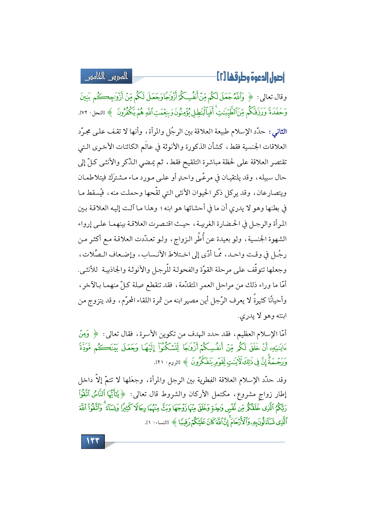 2 - حدّد الإسلام طبيعة العلاقة بين الرجُل والمرأة، وأنها لا تقف على مجرّد العلاقات الجنسية فقط، كشأن الذكورة والأنوثة في عالَم الكائنات الأخرى التي تقتصر العلاقة على لحظة مباشرة التلقيح فقط، ثم يمضي الذّكر والأنثى كلّ إلى حال سبيله، وقد يلتقيان في مرعىً واحدٍ أو على مورد ماء مشترَك فيتلاطمان ويتصارعان، وقد يركل ذكر الحيوان الأنثى التي لقّحها وحملت منه، فيُسقط ما في بطنها وهو لا يدري أن ما في أحشائها هو ابنه؛ وهذا ما آلت إليه العلاقة بين المرأة والرجل في الحضارة الغربية، حيث اقتصرت العلاقة بينهما على إرواء الشهوة الجنسية، ولو بعيدة عن أُطُر الزواج، ولو تعدّدت العلاقة مع أكثر من رجُل في وقت واحد، ممّا أدّى إلى اختلاط الأنساب، وإضعاف الصِّلات، وجعلها تتوقّف على مرحلة القوّة والفحولة للّرجل والأنوثة والجاذبية للأنثى. أمّا ما وراء ذلك من مراحل العمر المتقدّمة، فقد تنقطع صِلة كلّ منهما بالآخر، وأحياناً كثيرةً لا يعرف الرّجل أين مصير ابنه من ثمرة اللقاء المحرّم، وقد يتزوج من ابنته وهو لا يدري.