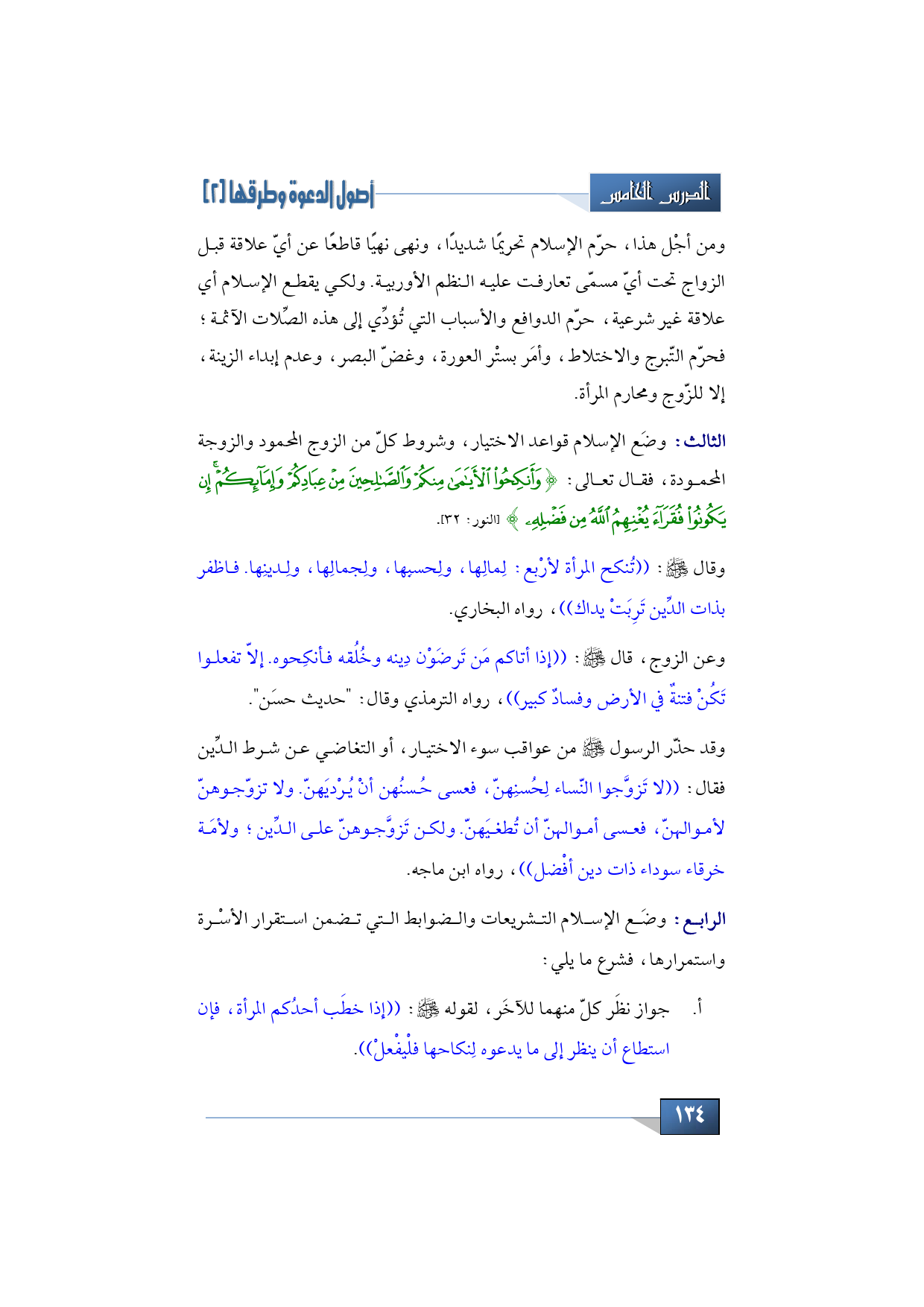 3 - وضَع الإسلام قواعد الاختيار، وشروط كلّ من الزوج المحمود والزوجة المحمودة، فقال تعالى: {وَأَنْكِحُوا الْأَيَامَى مِنْكُمْ وَالصَّالِحِينَ مِنْ عِبَادِكُمْ وَإِمَائِكُمْ إِنْ يَكُونُوا فُقَرَاءَ يُغْنِهِمُ اللَّهُ مِنْ فَضْلِهِ}.