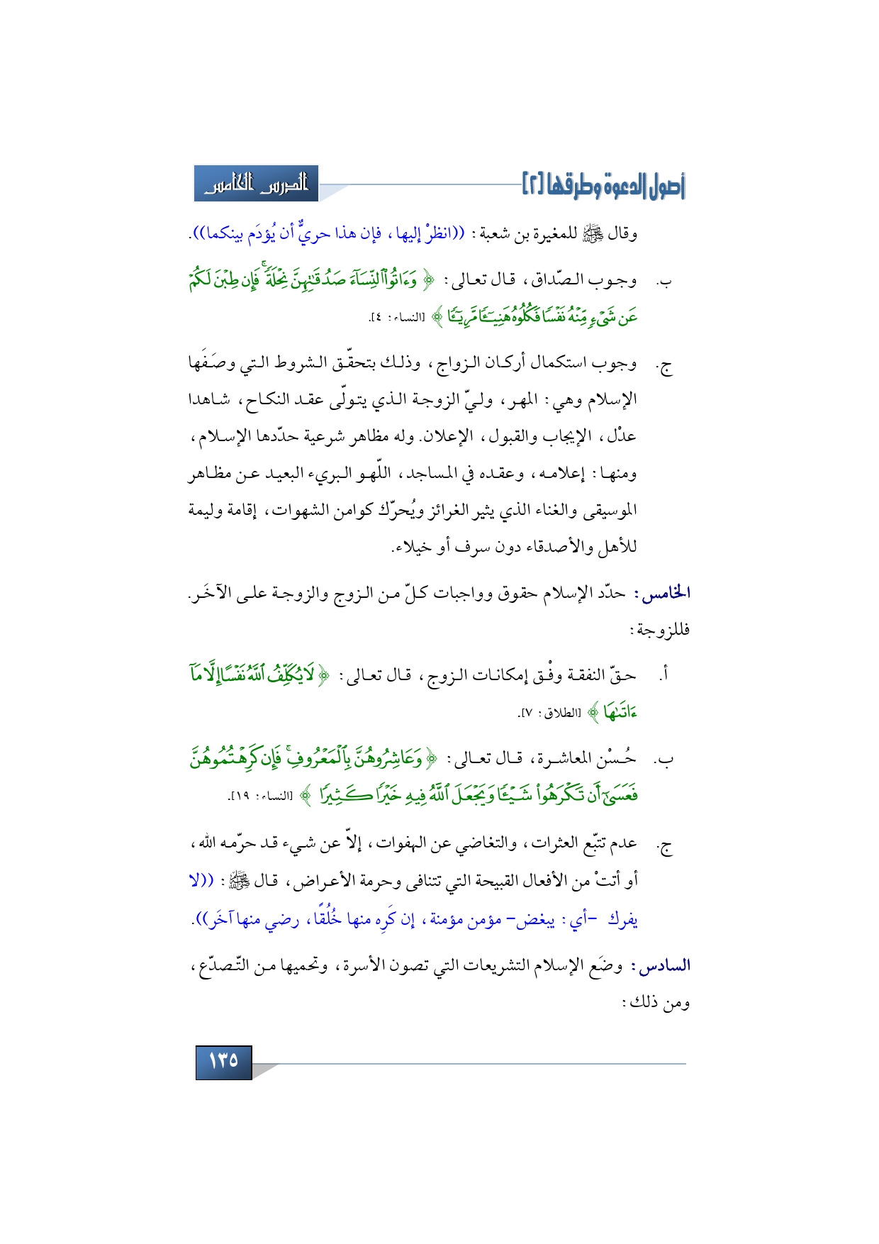 5 - حدّد الإسلام حقوق وواجبات كلّ من الزوج والزوجة على الآخَر. فللزوجة: