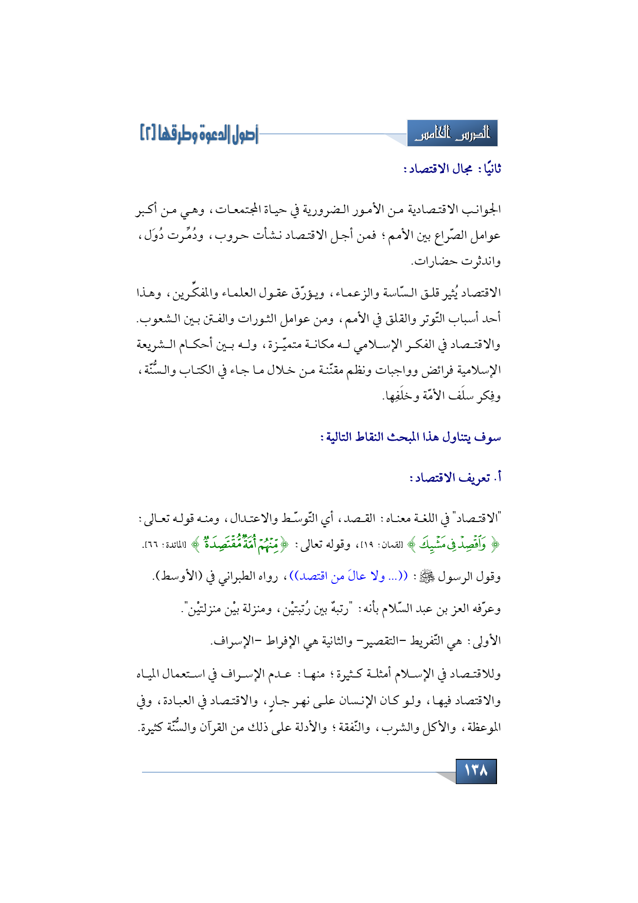 عدم الإسراف في استعمال المياه والاقتصاد فيها، ولو كان الإنسان على نهر جارٍ، والاقتصاد في العبادة، وفي الموعظة، والأكل والشرب، والنّفقة؛ والأدلة على ذلك من القرآن والسُّنّة كثيرة.