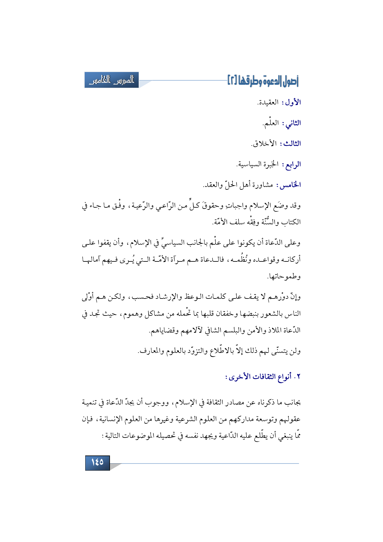 بجانب ما ذكرناه في المحاضرات السابقة عن مصادر الثقافة في الإسلام، ووجوب أن يجدّ الدّعاة في تنمية عقولهم وتوسعة مداركهم من العلوم الشرعية وغيرها من العلوم الإنسانية، فإن ممّا ينبغي أن يطّلع عليه الدّاعية ويجهد نفسه في تحصيله: الموضوعات التالية: