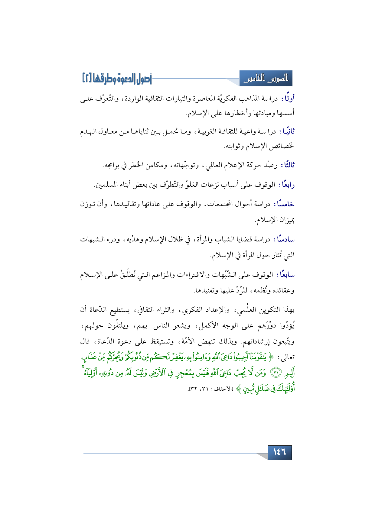 سادساً: دراسة قضايا الشباب والمرأة، في ظلال الإسلام وهدْيه، ودرء الشبهات التي تُثار حول المرأة في الإسلام.