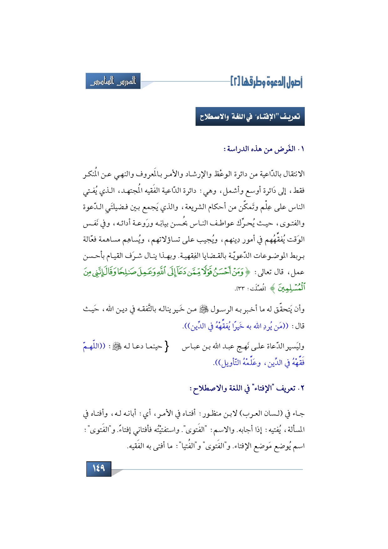 - الانتقال بالدّاعية من دائرة الوعْظ والإرشاد والأمر بالمَعروف والنهي عن المُنكر فقط، إلى دَائرة أوسع وأشمل، وهي: دائرة الدّاعية الفَقيه المُجتهد، الذي يُفتي الناس على عِلْم وتَمكّن من أحكام الشريعة، والذي يَجمع بين فضيلتَيِ الدّعوة والفتوى، حيث يُحرِّك عواطف الناس بحُسن بيانِه ورَوعة أدائه، وفي نَفس الوَقت يُفقِّهُهم في أمور دِينهم، ويُجيب على تساؤلاتهم، ويُساهِم مساهمة فعّالة بربط الموضوعات الدّعويّة بالقضايا الفِقهية. وبهذا ينال شرَف القيام بأحسن عمل، قال تعالى: {وَمَنْ أَحْسَنُ قَوْلاً مِمَّنْ دَعَا إِلَى اللَّهِ وَعَمِلَ صَالِحاً وَقَالَ إِنَّنِي مِنَ الْمُسْلِمِينَ}.