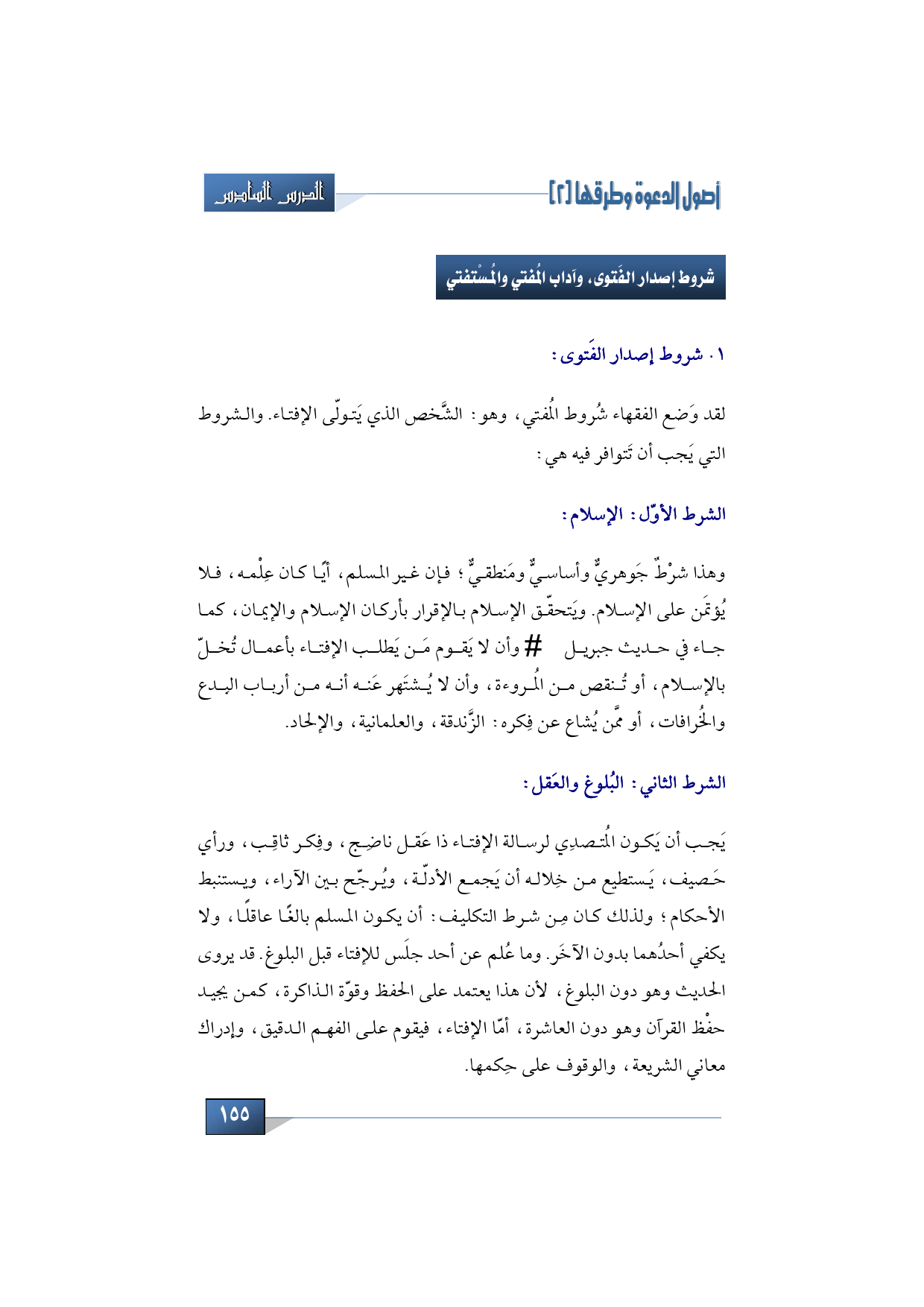 البُلوغ والعَقل: يَجب أن يَكون المُتصدِي لرسالة الإفتاء ذا عَقل ناضِج، وفِكر ثاقِب، ورأي حَصيف، يَستطيع من خِلاله أن يَجمع الأدلّة، ويُرجّح بين الآراء، ويستنبط الأحكام؛ ولذلك كان مِن شرط التكليف: أن يكون المسلم بالغاً عاقلاً، ولا يكفي أحدُهما بدون الآخَر. وما عُلم عن أحد جلَس للإفتاء قبل البلوغ. قد يروى الحديث وهو دون البلوغ، لأن هذا يعتمد على الحفظ وقوّة الذاكرة، كمن يجيد حفْظ القرآن وهو دون العاشرة، أمّا الإفتاء، فيقوم على الفهم الدقيق، وإدراك معاني الشريعة، والوقوف على حِكمها.