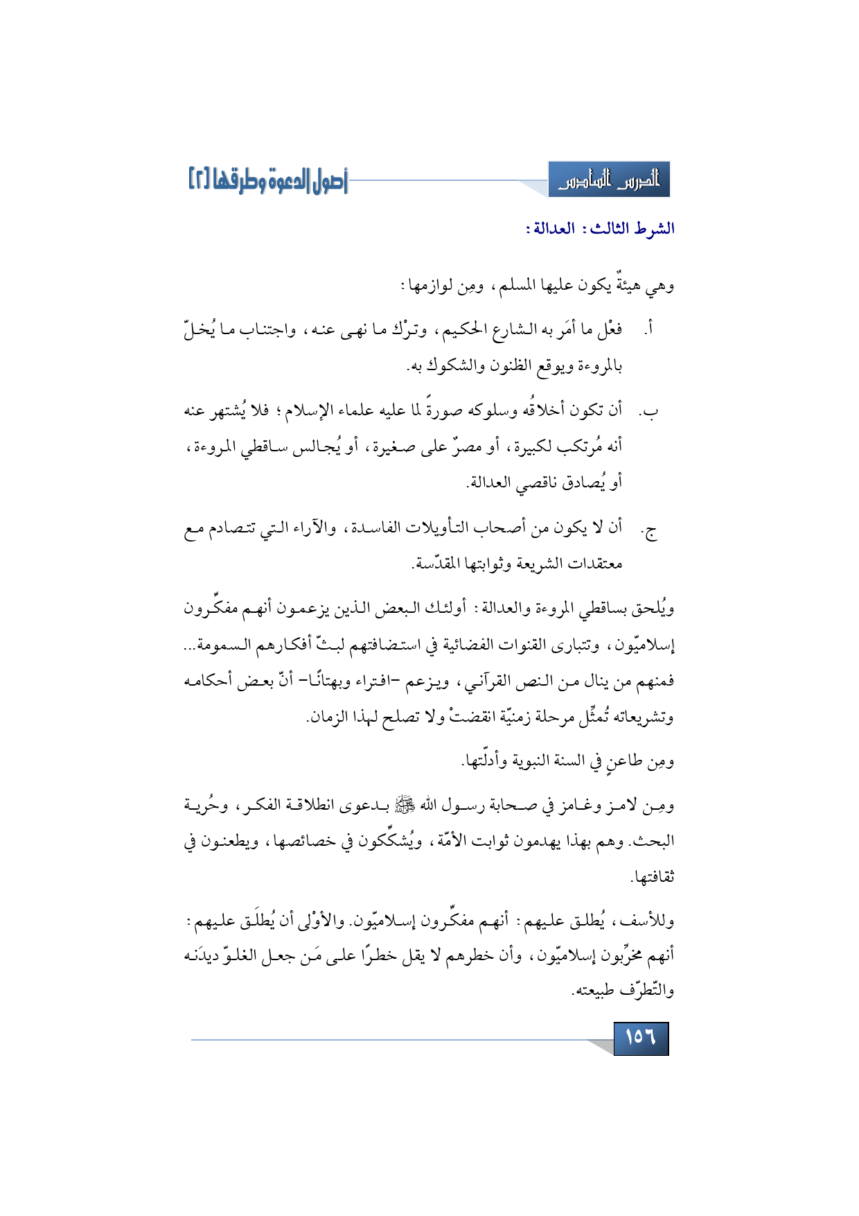 العدالة: وهي هيئة يكون عليها المسلم، ومِن لوازمها: