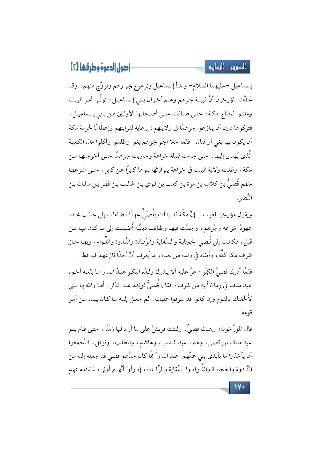 إسماعيل -عليهما السلام- ونشأ إسماعيل وترعرع بجوارهم وتزوَّج منهم، وقد تحدَّث المؤرخون أنَّ قبيلة جرهم وهم أخوال بني إسماعيل، تولَّوا أمر البيت وملأوا فجاج مكة، حتى ضاقت على أصحابها الأولين من بني إسماعيل، فتركوها دون أن ينازعوا جرهماً في ولايتهم؛ رعاية لقرابتهم وإعظاماً لحرمة مكة أن يكون بها بغي أو قتال، فلما خلا الجو لجرهم بغوا وظلموا وأكلوا مال الكعبة الَّذي يُهدى إليها، حتى جاءت قبيلة خزاعة وحاربت جرهما حتى أخرجتها من مكة، وظلت ولاية البيت في خزاعة يتوارثها بنوها كابراً عن كابر، حتى انتزعها منهم قُصيُّ بن كلاب بن مرة بن كعب بن لؤي بن غالب بن فهر بن مالك بن النَّضر.