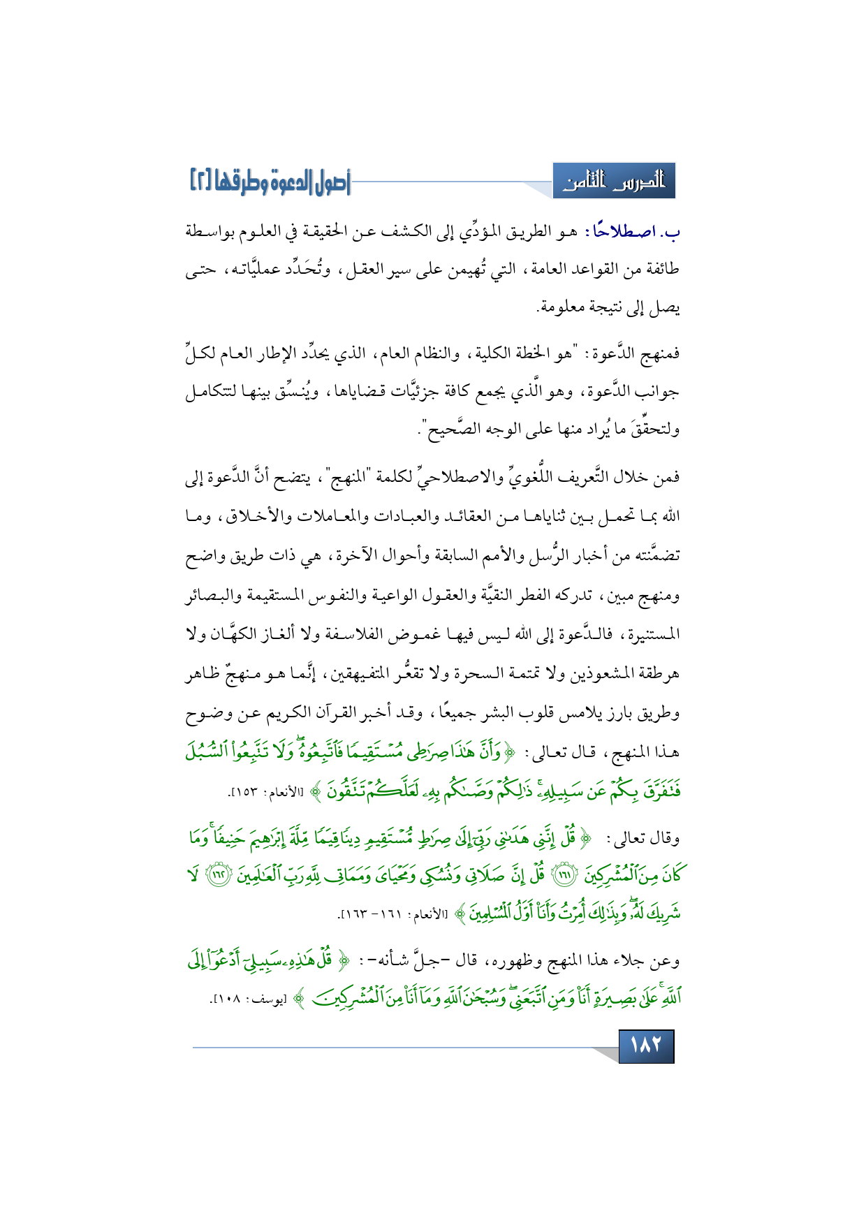 فمنهج الدَّعوة: "هو الخطة الكلية، والنظام العام، الذي يحدِّد الإطار العام لكلِّ جوانب الدَّعوة، وهو الَّذي يجمع كافة جزئيَّات قضاياها، ويُنسِّق بينها لتتكامل ولتحقِّقَ ما يُراد منها على الوجه الصَّحيح".