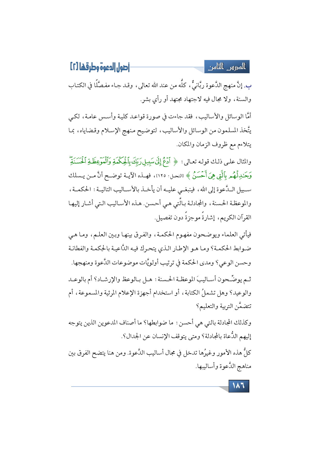 {ادْعُ إِلَى سَبِيلِ رَبِّكَ بِالْحِكْمَةِ وَالْمَوْعِظَةِ الْحَسَنَةِ وَجَادِلْهُمْ بِالَّتِي هِيَ أَحْسَنُ} [النحل:125].