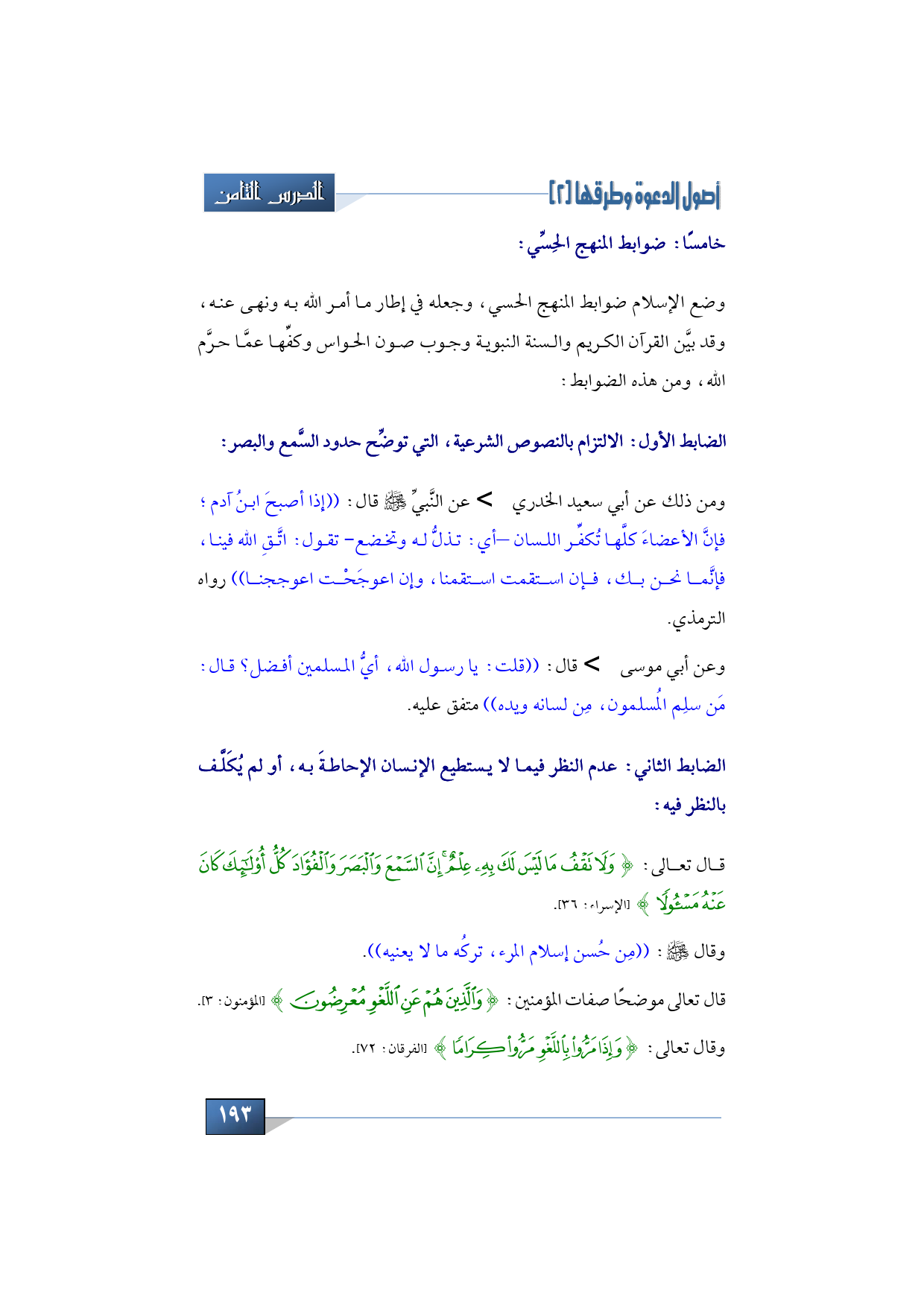 1 - الالتزام بالنصوص الشرعية، التي توضِّح حدود السَّمع والبصر: ومن ذلك عن أبي سعيد الخدري -رضي الله عنه- عن النَّبيِّ -صلَّى الله عليه وسلَّم- قال: ((إذا أصبحَ ابنُ آدم؛ فإنَّ الأعضاءَ كلَّها تُكفِّر اللسان -أي تذلُّ له وتخضع- تقول: اتَّقِ الله فينا، فإنَّما نحن بك، فإن استقمت استقمنا، وإن اعوجَحْت اعوججنا)) رواه الترمذي.