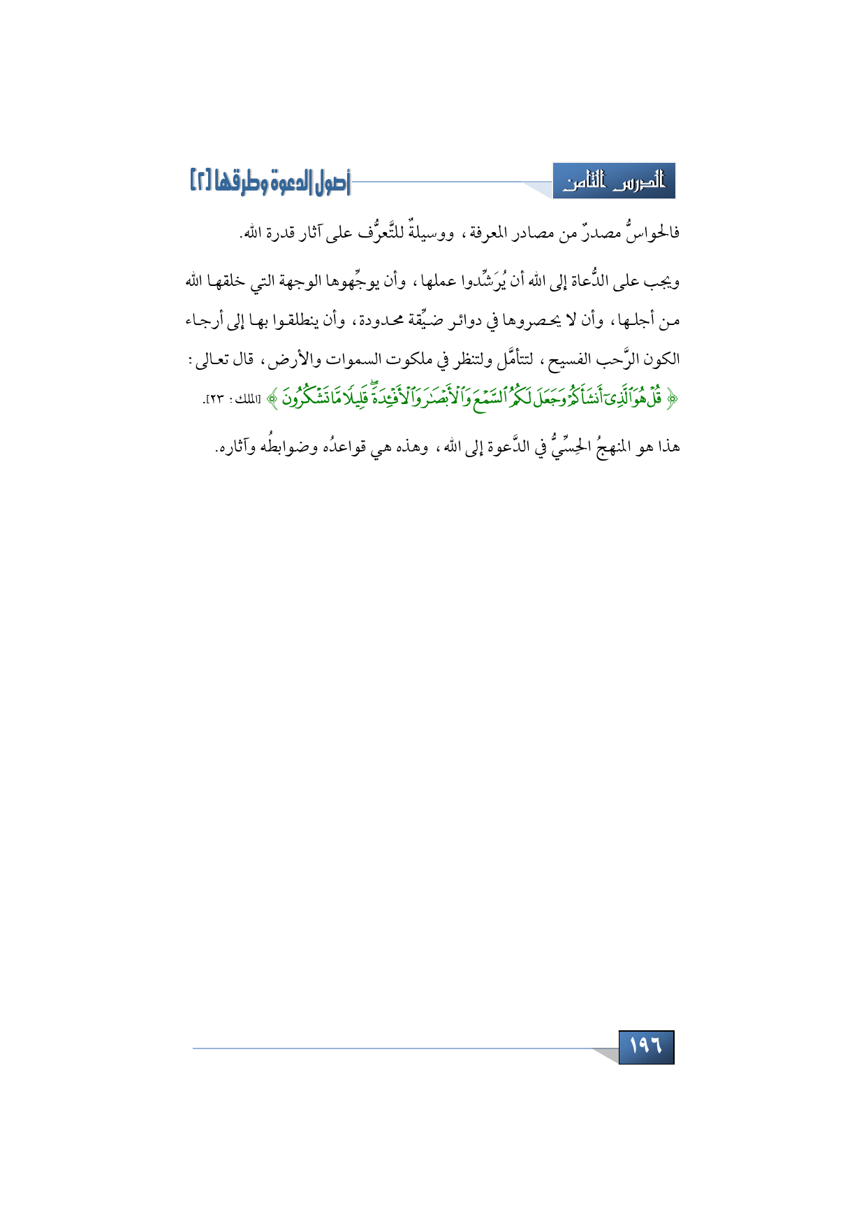 هذا هو المنهجُ الحِسِّيُّ في الدَّعوة إلى الله، وهذه هي قواعدُه وضوابطُه وآثاره، أمَّا عن المنهج العقليِّ والعاطفيِّ، فهذا موضوع المحاضرة القادمة، إن شاء الله.