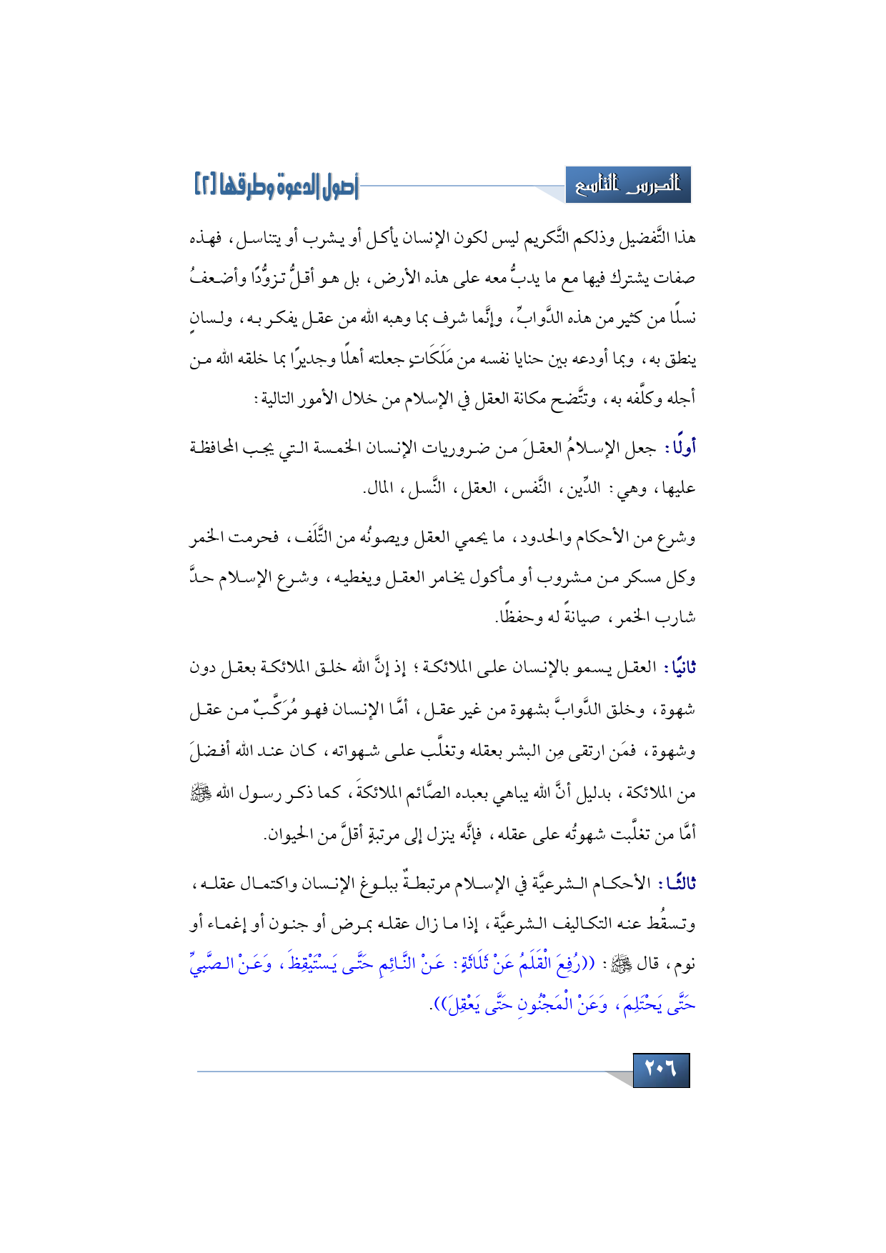 3 - الأحكام الشرعيَّة في الإسلام، مرتبطةٌ ببلوغ الإنسان واكتمال عقله، وتسقُط عنه التكاليف الشرعيَّة، إذا ما زال عقله بمرض أو جنون أو إغماء أو نوم، قال -صلَّى الله عليه وسلَّم-: ((رُفِعَ الْقَلَمُ عَنْ ثَلَاثَةٍ: عَنْ النَّائِمِ حَتَّى يَسْتَيْقِظَ، وَعَنْ الصَّبِيِّ حَتَّى يَحْتَلِمَ، وَعَنْ الْمَجْنُونِ حَتَّى يَعْقِلَ)).