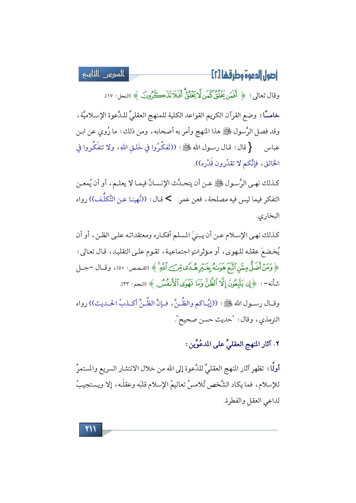 5 - وضع القرآن الكريم، القواعد الكلية للمنهج العقليِّ للدَّعوة الإسلاميَّة، وقد فصل الرَّسول -صلَّى الله عليه وسلَّم- هذا المنهج وأمر به أصحابه، ومن ذلك ما رُوي عن ابن عباس -رضي الله عنهما- قال: قال رسول الله -صلَّى الله عليه وسلَّم-: ((تَفكَّرُوا في خَلقِ اللهِ، ولا تتفَكَّروا في الخالق، فإنَّكم لا تقدُرون قَدْره)).